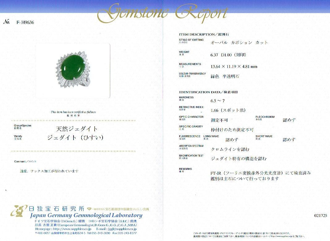 1点限定品 艶々の大粒6カラット石 天然翡翠 6.37ct 天然ダイヤ取巻1.00ct プラチナリング 卸価格 商品動画あり 送料込