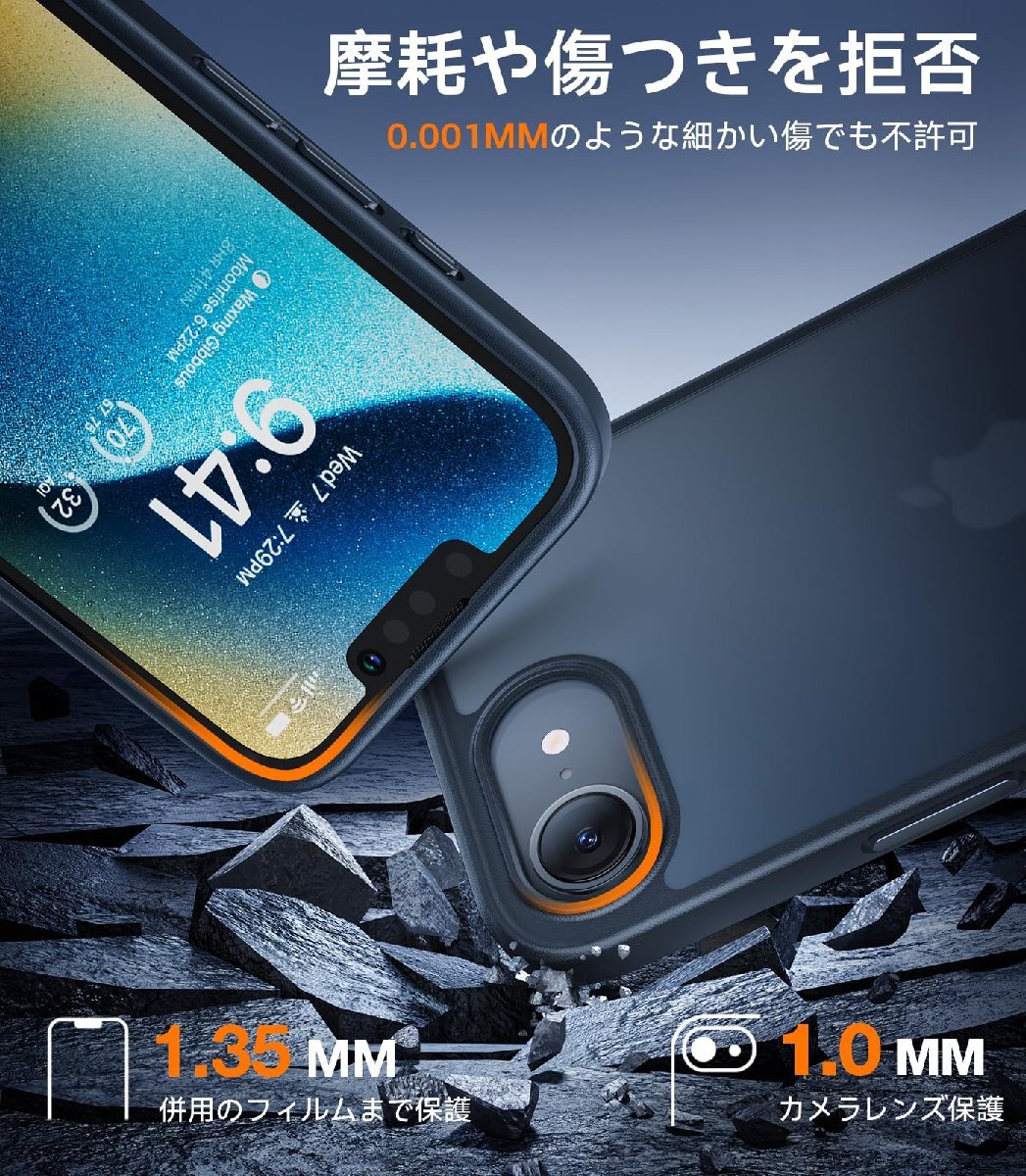 【レンズ・画面まで細部保護】iPhone 16e に合わせた曲線に従った高低差設計で、液晶画面より 1.2mm 高く、カメラレンズより 1.2mm 高く、外部と接触せず傷をつける心配はありません。背面サイドは少し高めになっており、滑り止め機能が付いており、ケースの背面も傷から守れます。iPhone 16e ケース