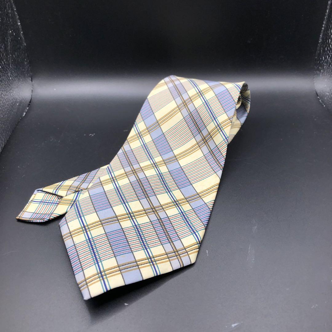 チェック柄のハンドメイドネクタイ、イエロー・ブルー・グレーの配色が特徴。