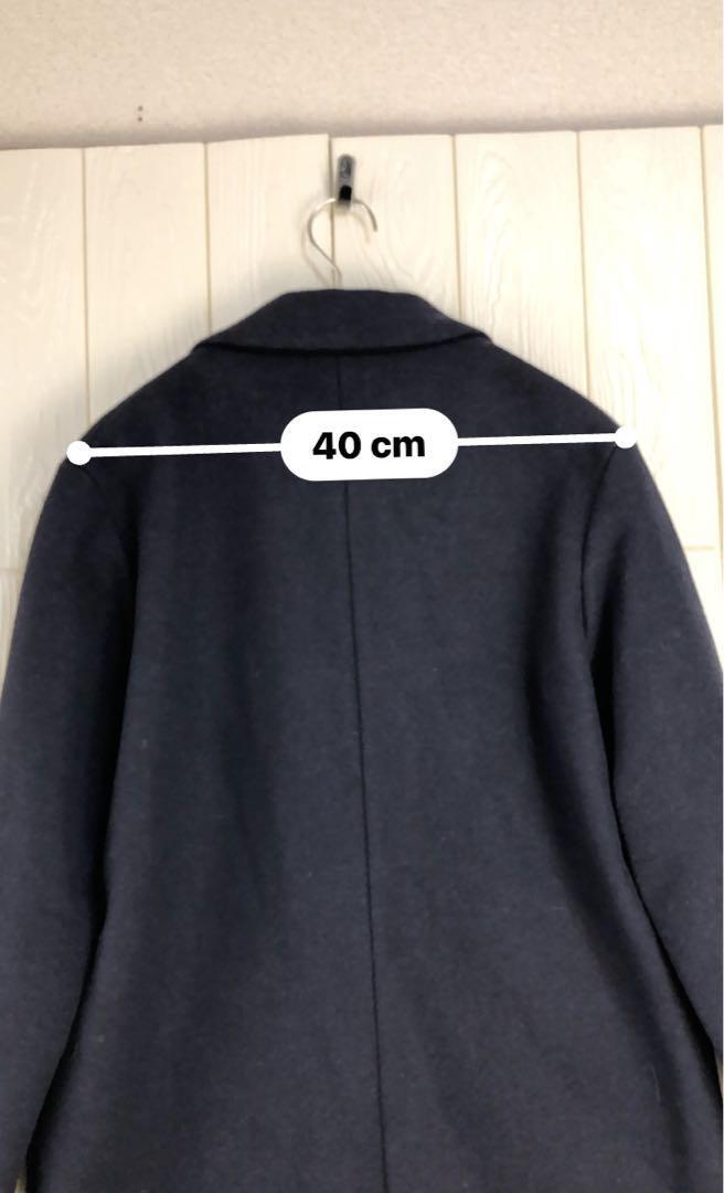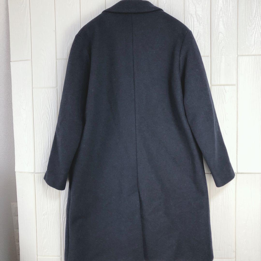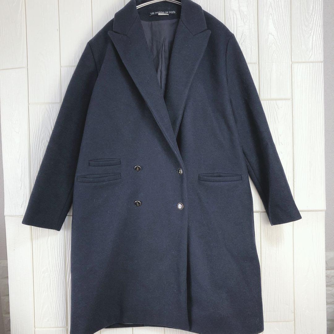 ダークネイビーのダブルブレストチェスターコート、前面に2つのポケット付き。