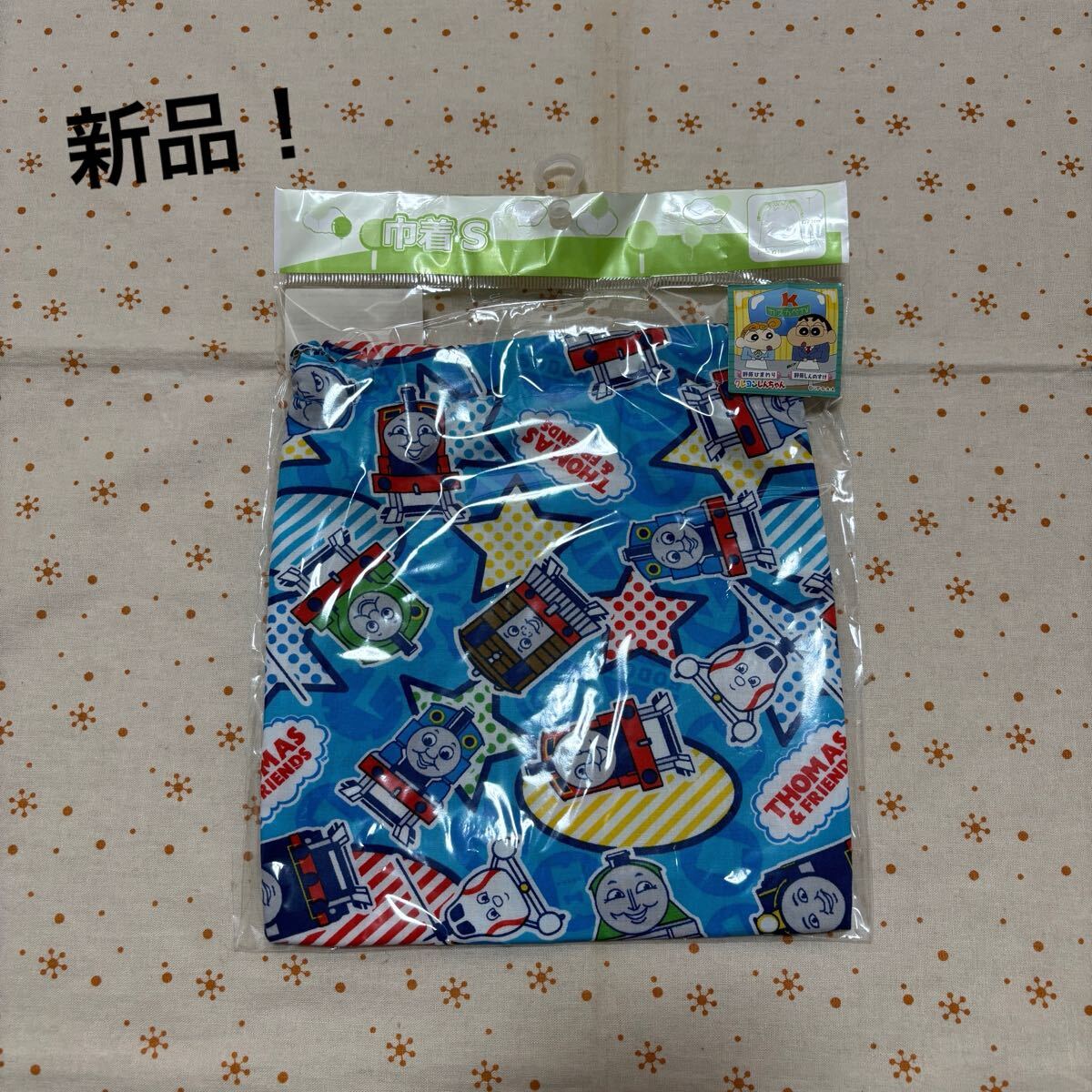 トーマスのキャラクターがデザインされた青色の巾着袋。