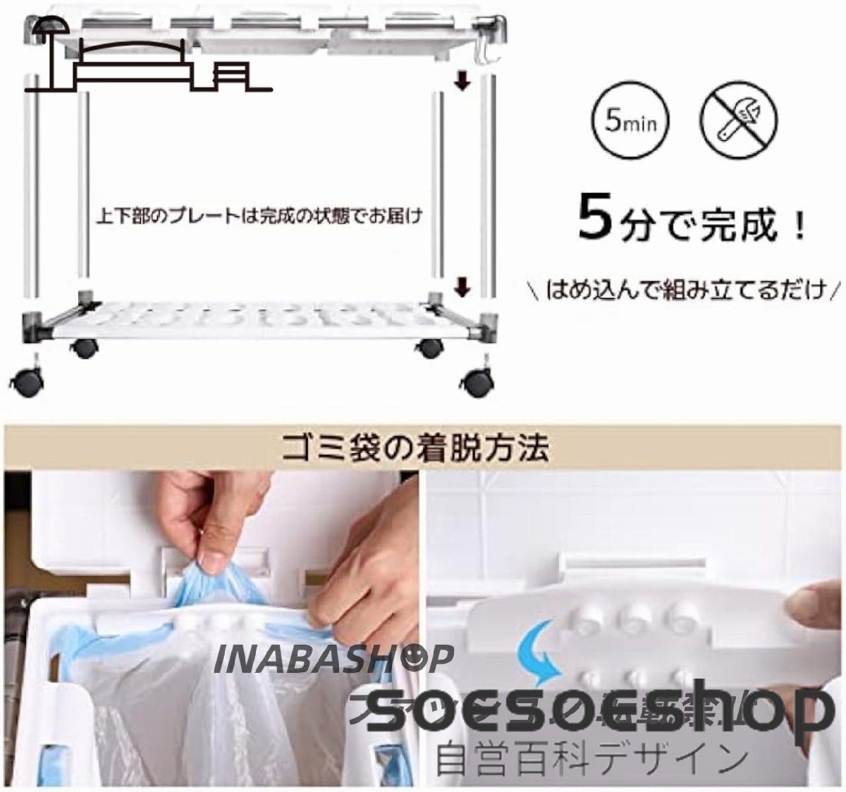 【5分完成!かんたん組み立て】上下部のプレートは完成の状態でお届けします。ネジを使わないから5分で完成!各パーツをはめ込んで組み立てるだけです。ごみ袋の装着も簡単:ごみ袋を挟んで蓋内部にあるスナップでとめればセット完了です。Point:スナップをとめるには、パイプを握らず、蓋の外縁を握ることでうまくスナップをとめることができます。