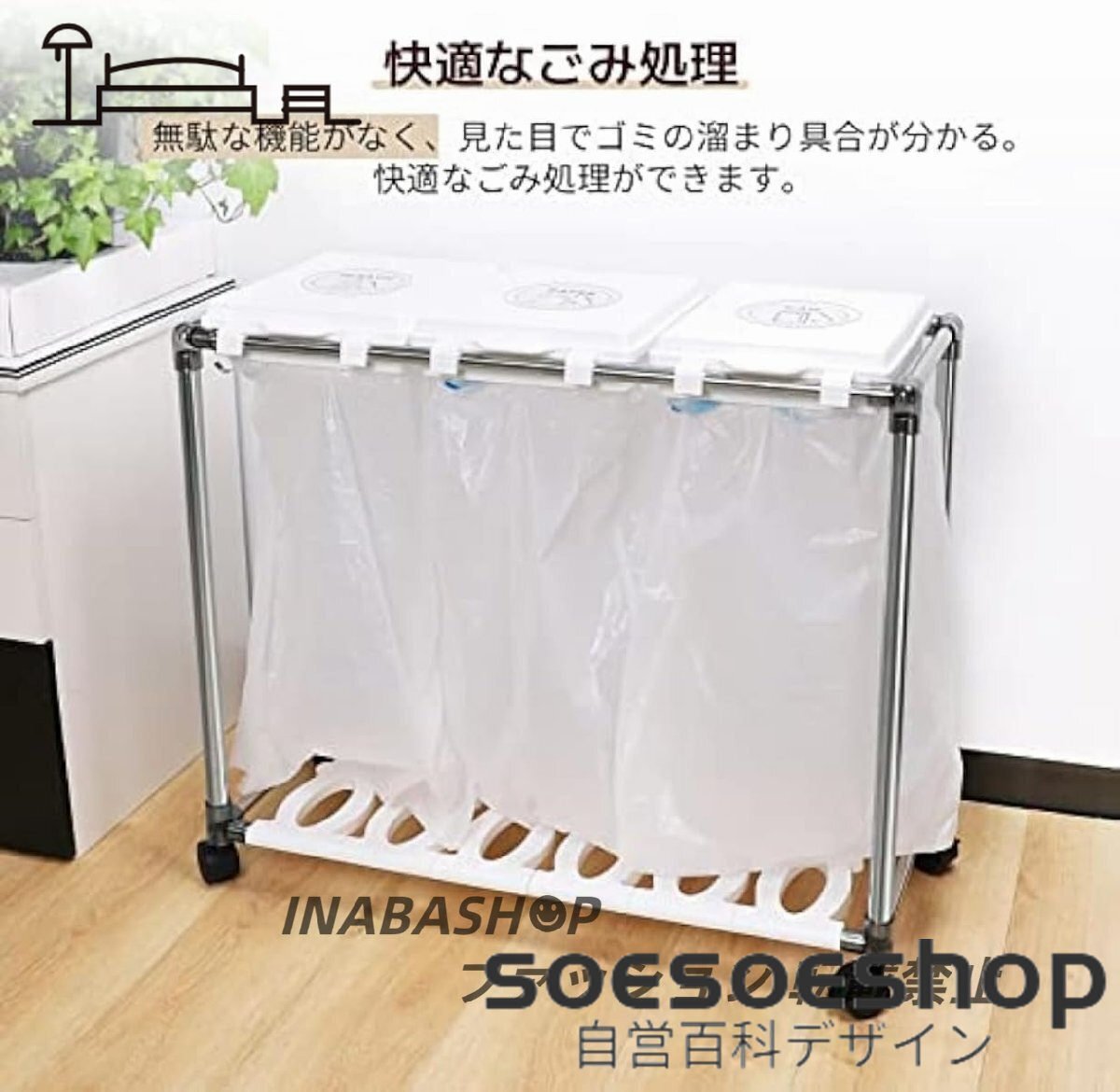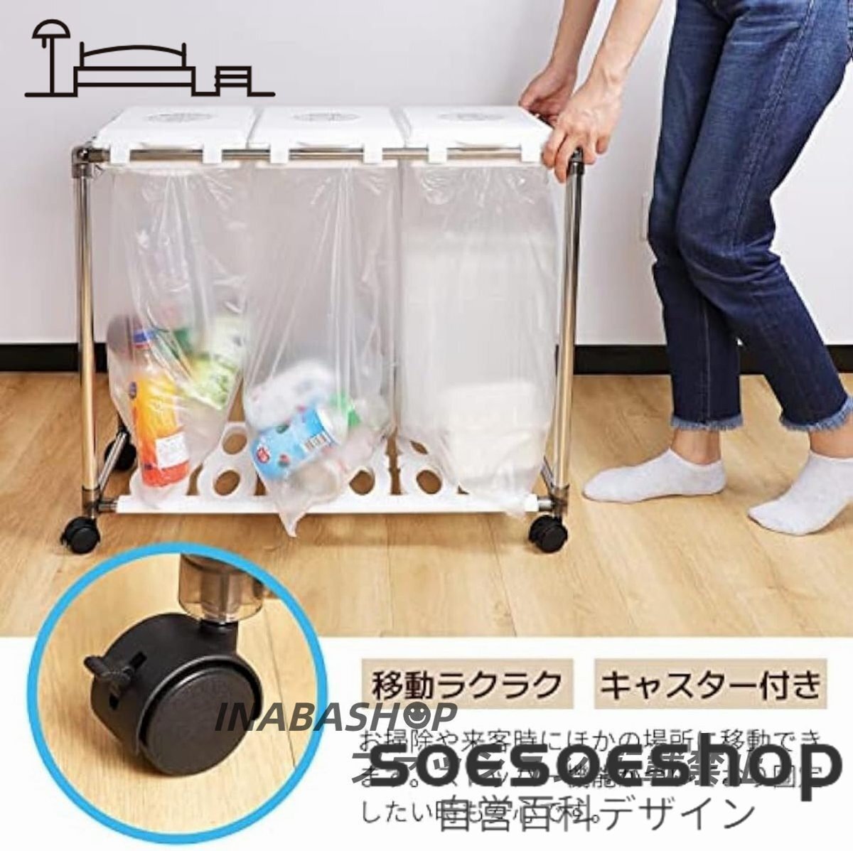 【総容量30L×3・袋満載まで入れられる】合計90Lの大容量ながら3分別のゴミ袋スタンド 。箱と違ってビニール袋の柔軟性を利用できて沢山はいります。プラスチック、缶・ビン・ペットボトルなど、色々な種類のゴミ箱を置く必要無し、1台だけでスッキリ分別が可能です。本製品は、一般家庭用の20~30L用ゴミ袋最適な分別ゴミ箱です。