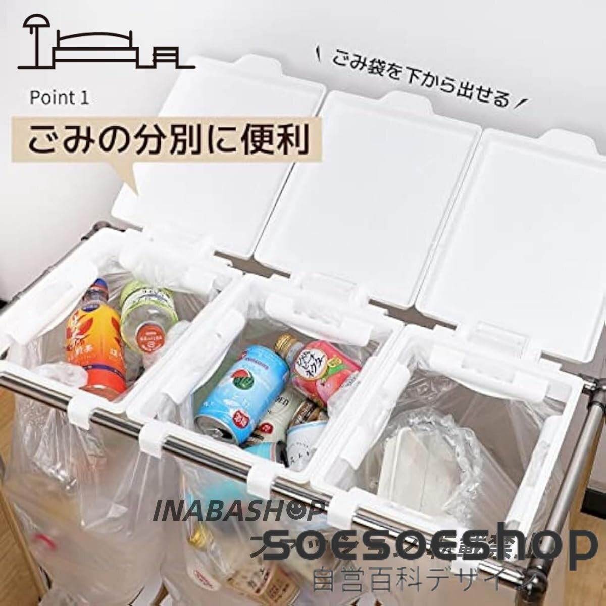 【便利さにこだわった分別ゴミ箱】①底面には、ごみ袋の保管にも便利なフレームが備わって、ゴミ出しの時の袋の交換がスムーズになります。大きなゴミ袋でも床に擦れて破ける心配なくセットできます。②サイドフックは普段あまり出ないゴミや溜まるのに時間がかかるようなゴミの指定位置に、例えば乾電池やブルダブなど小さいな分別におすすめです。