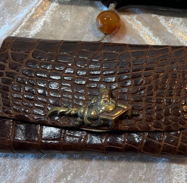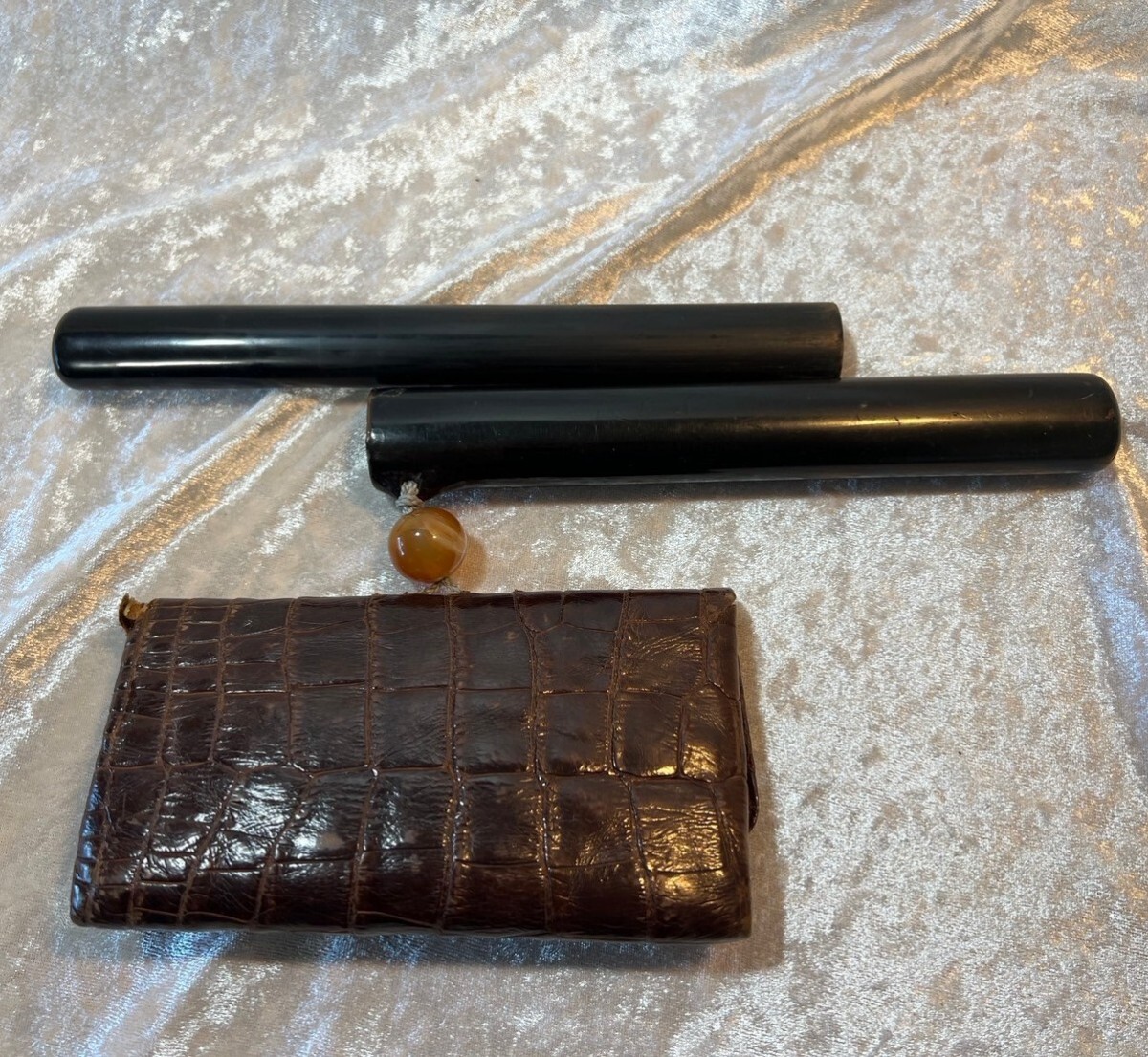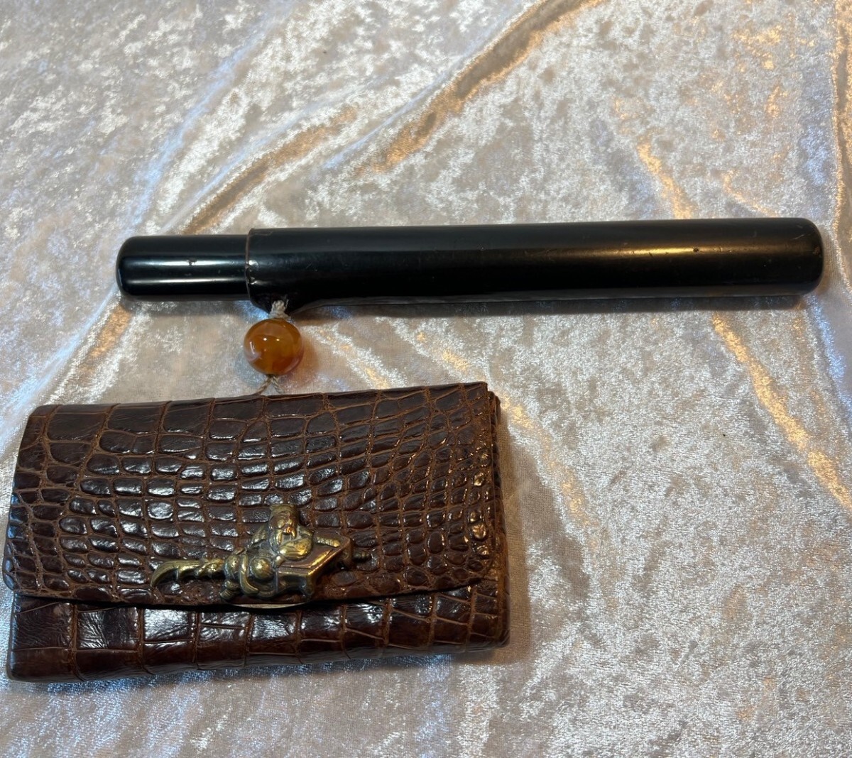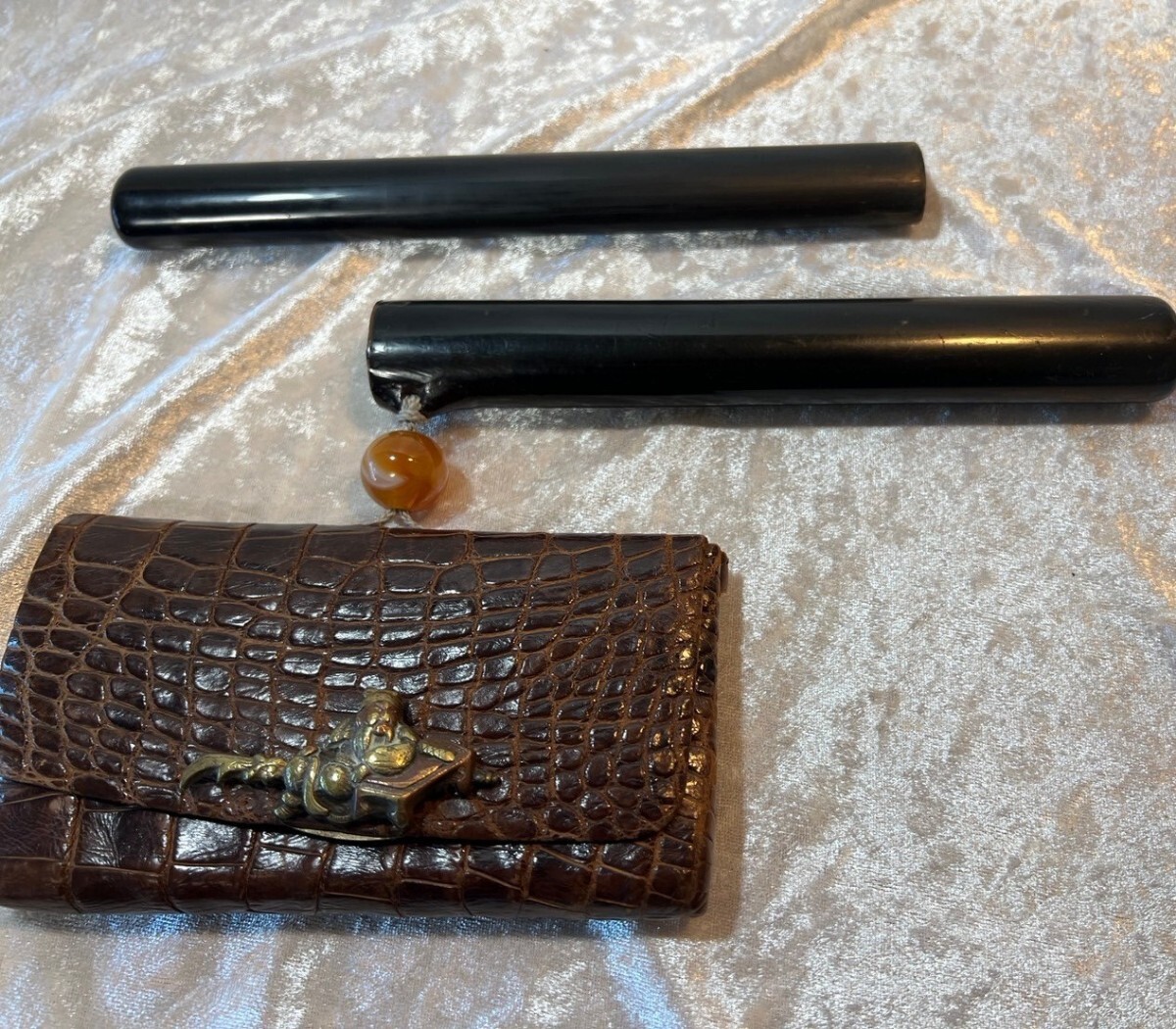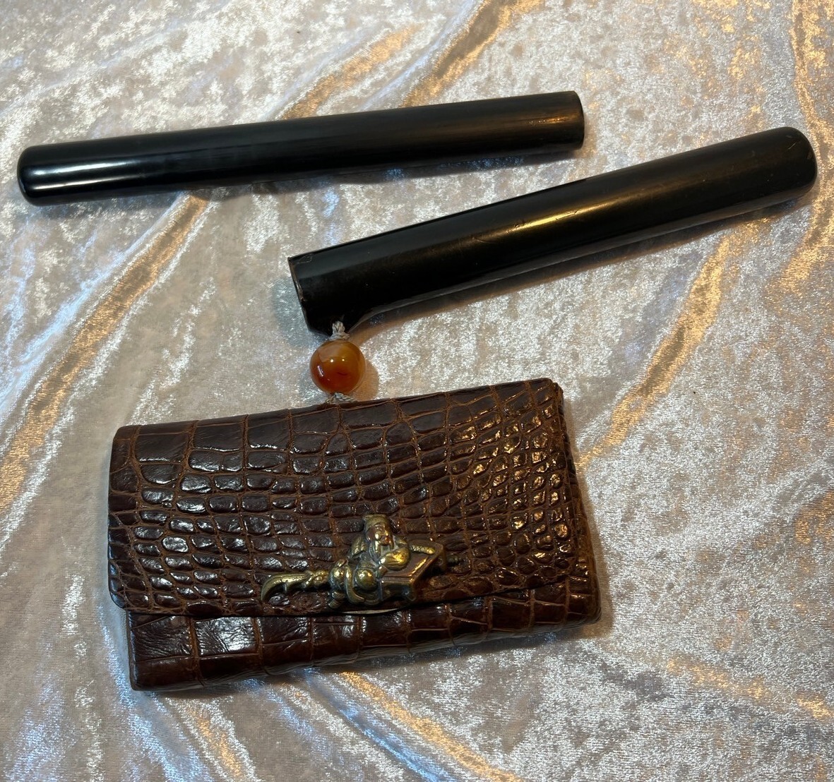 【提物・根付・印籠】煙草入れとキセル入れ 革製 関羽 緒締め付き 差し 提げもの 印籠 江戸時代 ディスプレイ用品 インテリア用品 骨董品 アンティーク商品説明+++ 商品名:煙草入れとキセル入れ
