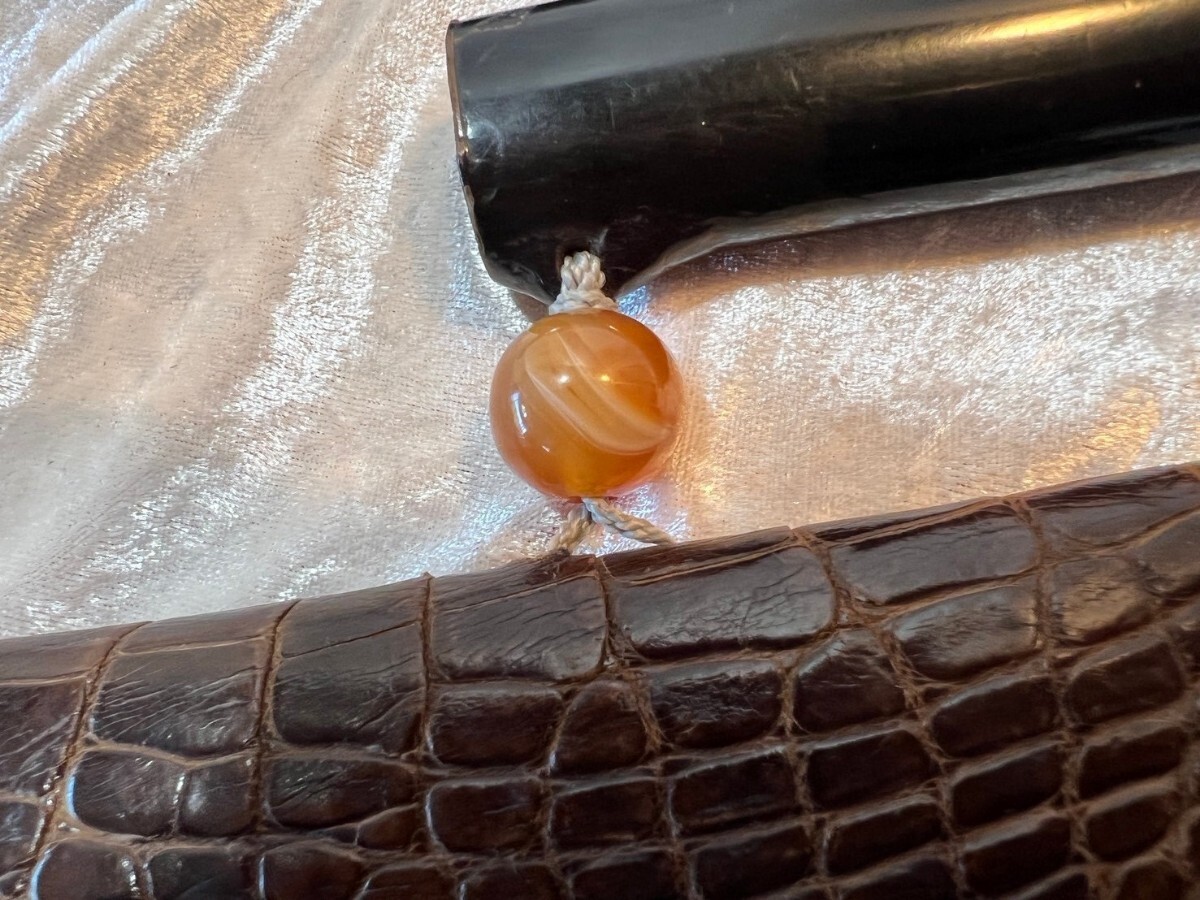 前金具は三国志の関羽、緒締めはメノウです。中古品ですので保管中の汚れ、小傷や擦れ、塗装の劣化、他製造過程のロス等ある場合がございます。