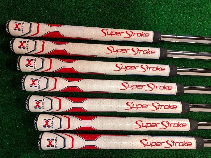 ●7番は練習場のみの使用状態でヘッドにわずかにキズがあるぐらいの美品です。 4番、5番、6番、8番、9番、PWはヘッドにシュリンクが付いている未使用品です。(店頭展示品ですので、シュリンクにキズや破れがある場合がございます。) グリップにはシュリンクは付いていません。(入荷時は未使用品ですが、店頭展示品ですので、スーパーストロークのグリップの性質上、若干の汚れを生じる場合がございます。)