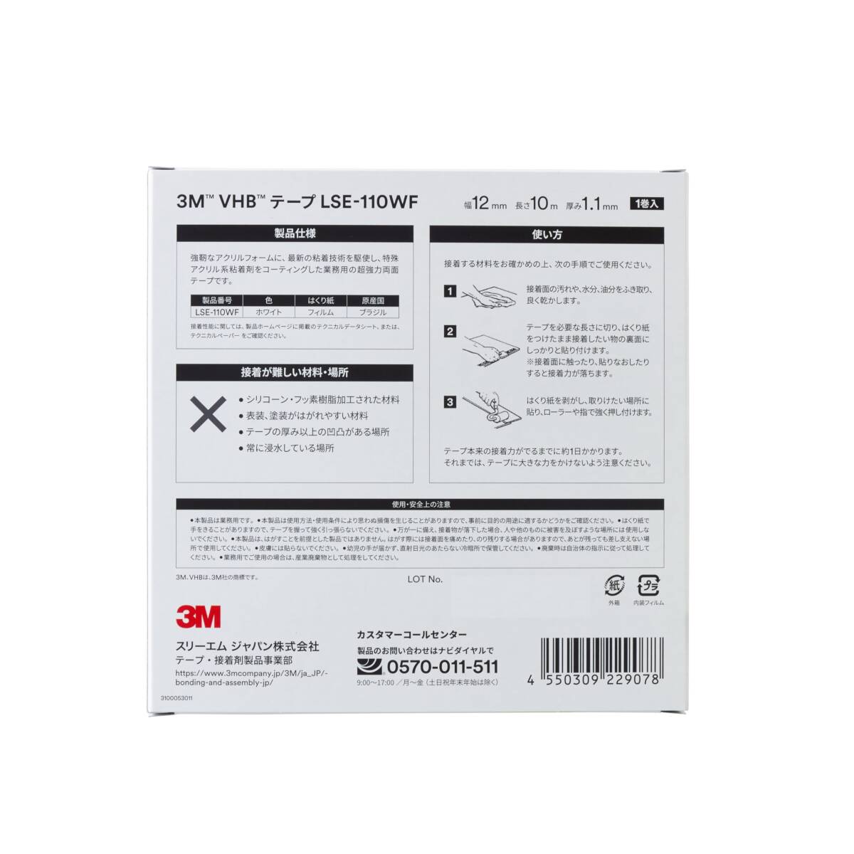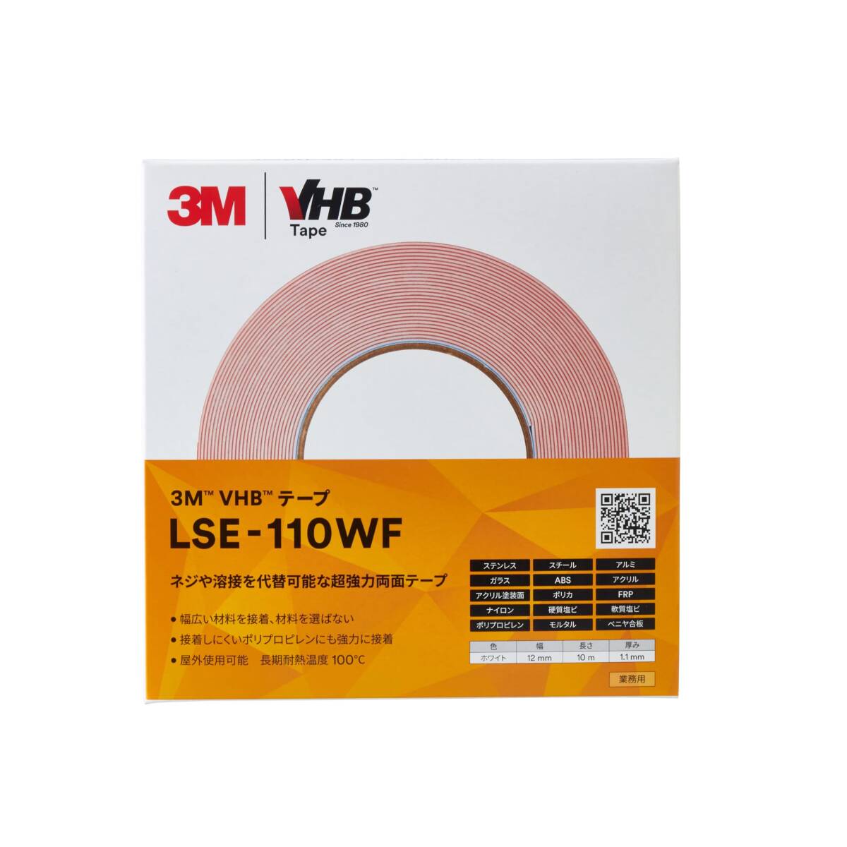 3M 屋内 屋外 多用途 VHB テープ LSE-110WF, 白, 12 mm x 10 m, 1.1 mm厚