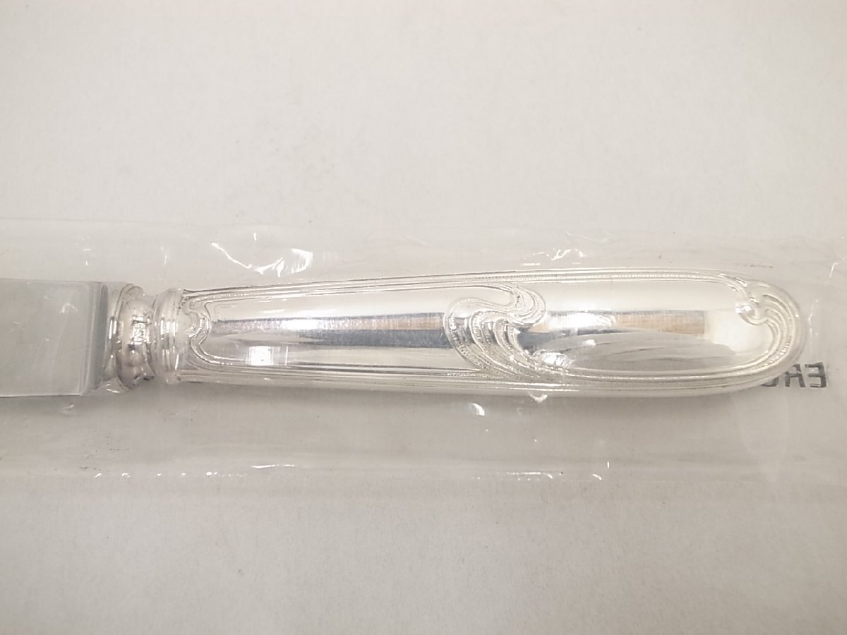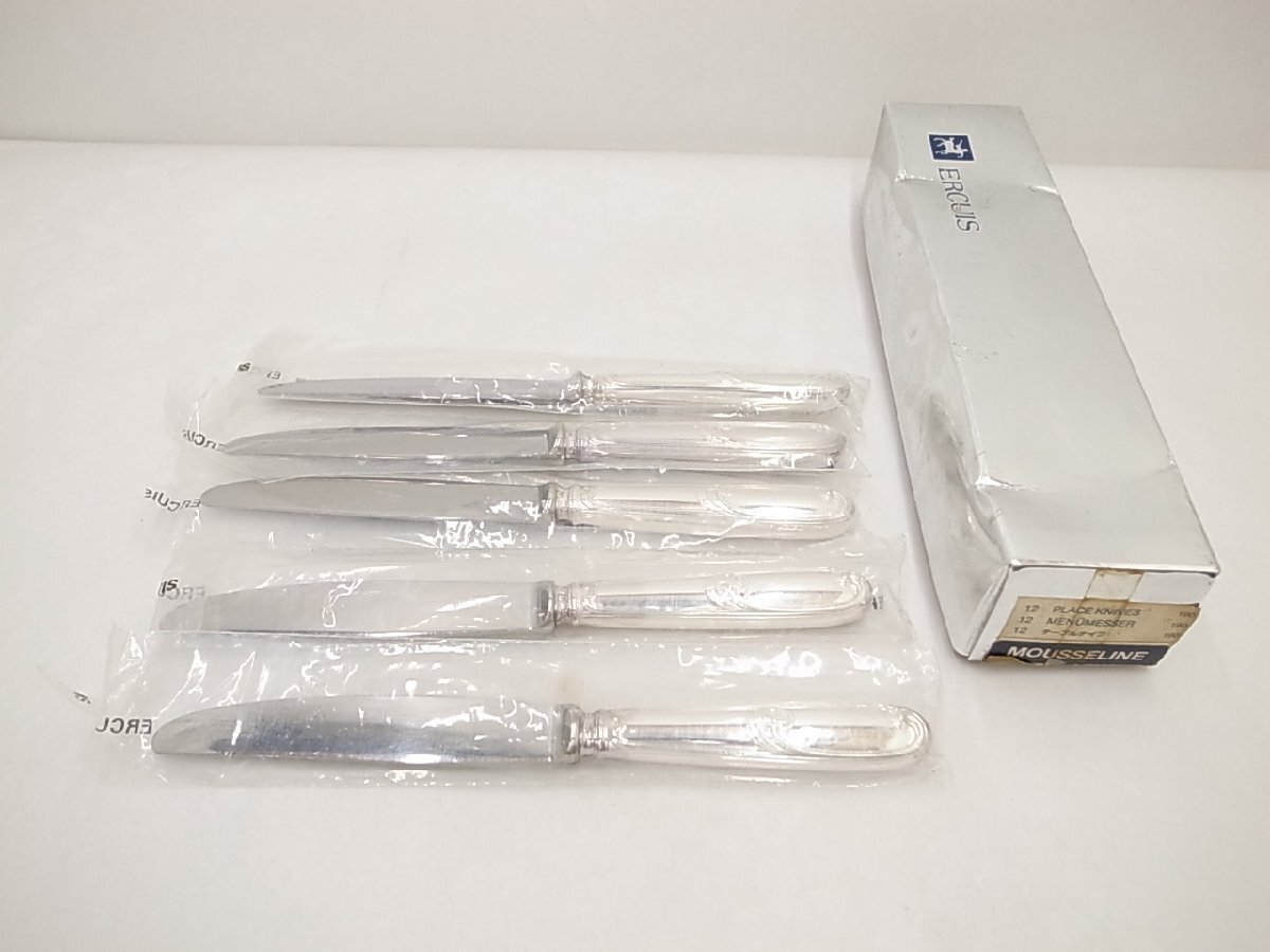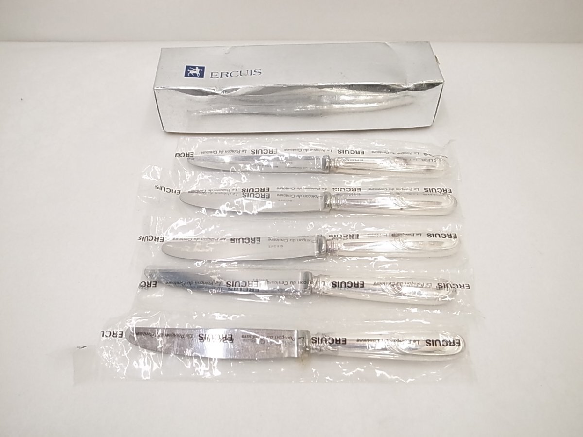 ブランド エルキューイ 商品名 テーブルナイフ 5本Set 重量 1本 約89.5g カラー シルバー サイズ 約全長20.5cm 素材 銀メッキ 付属品 箱(状態が良くありません) 状態 SA:保管期間によるくすみ等ございます。 コメント エルキューイの銀メッキカトラリーのコレクションは、欧州の基準とされる33ミクロン以上のメッキ厚で製造しており、美しい仕上がりを実現していて優雅な時間を演出してくれます。是非この機会にいかがでしょうか*☆。・