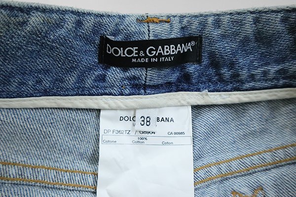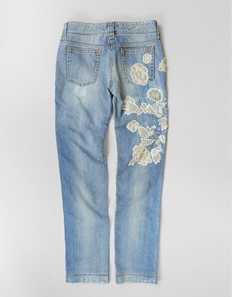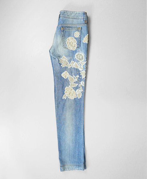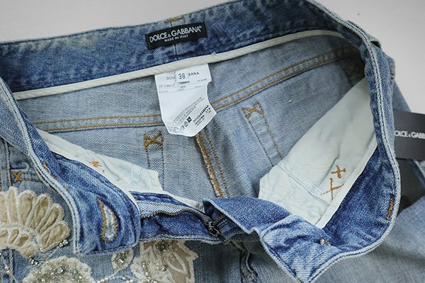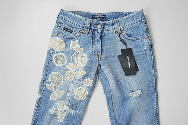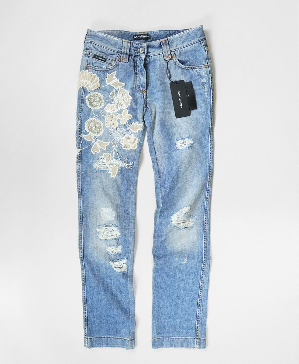 未使用 DOLCE&GABBANA ◆フラワーパッチ&ビジュー装飾 デニムパンツ インディゴ サイズ38 クラッシュジーンズ ドルチェ&ガッバーナ 32/K2K