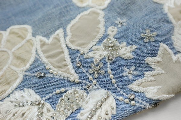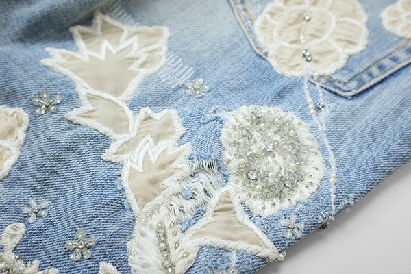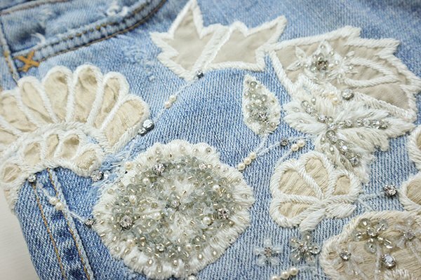 刺繍を施したパッチにビーズやラインストーンを散りばめたデザイン
