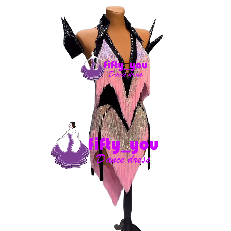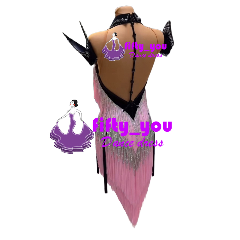 新品fifty_you レディース社交ダンス衣装  ラテン競技デモパーティー用ドレス セミオーダー ピンク フリンジ+ストーンビーズ