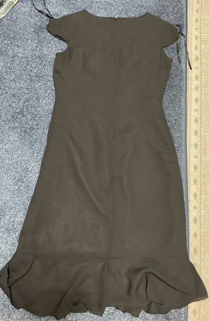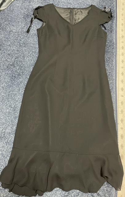 【商品の説明】Vネックのフェミニンフレンチ袖ワンピース、ストレッチナシ。裏地あり。