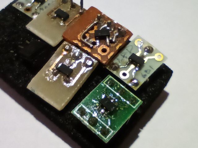 本当は3本足のTO-92パッケージの方が取り扱いやすいんですが、偽物が出回ってるようなので、細かい作業になりますがチップ版が現行品なので安心です。いがいと普通のはんだゴテで付けられます。