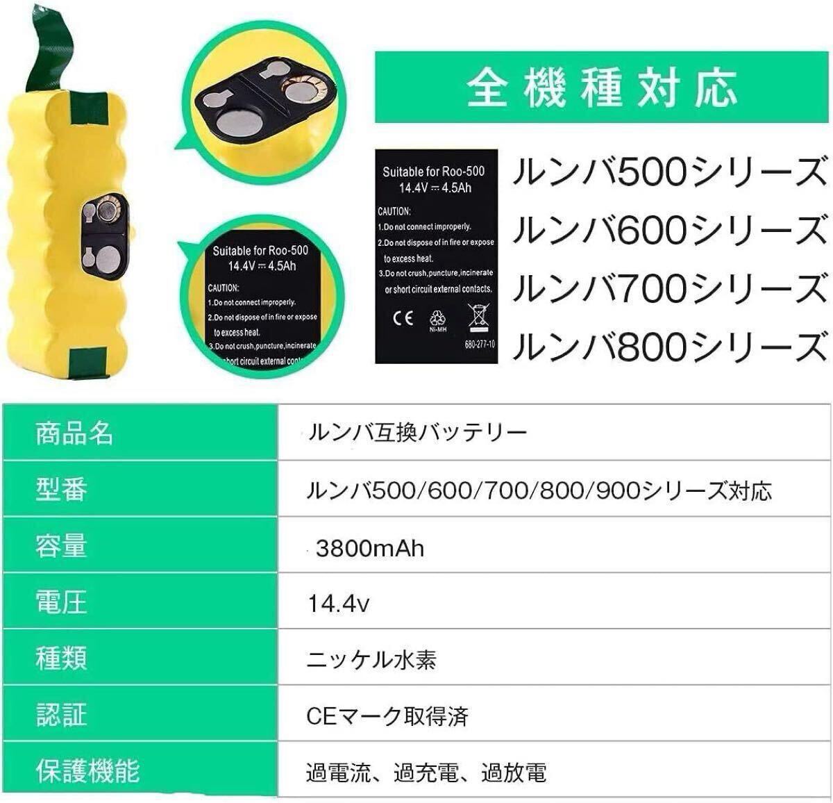 • 【商品仕様】:ルンバ 14.4vバッテリー ルンババッテリー14.4v ルンバ 互換バッテリー14.4v 3.8Ah 電池タイプ: Ni-MH 電池電圧: 14.4V 掃除機ルンバのニッケル水素互換バッテリーです 大容量4500mAhのため純正品より稼働時間が約1.5倍程度伸びます。電池サプライヤーとして、当店で提供している製品はすべてメーカーの元包装で、中間業者が差額を稼いでおらず、価格で絶対的な優位を占めており、できるだけお客様のためにより満足な購入機会を目指しています。ご安心購入してください。
