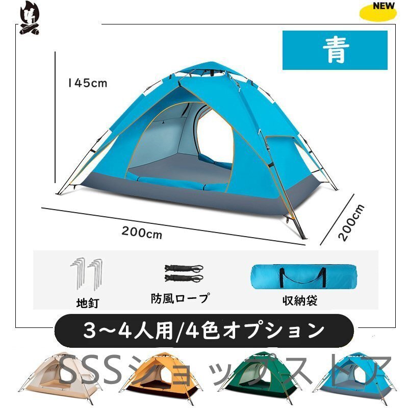 テント ポップアップテント ワンタッチテント 簡単セット 軽量 コンパクト アウトドア キャンプ 3-4人用 青