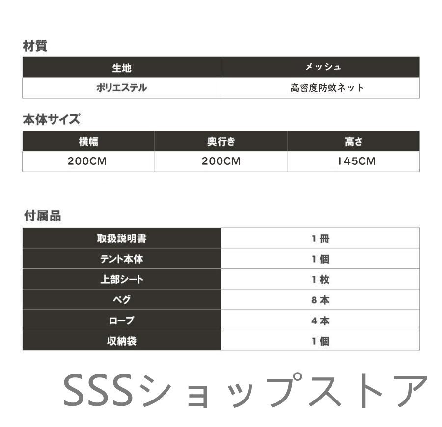 付属品:アース釘8本、防風ロープ4本、トップオーニング1枚、ハンドバッグ1個