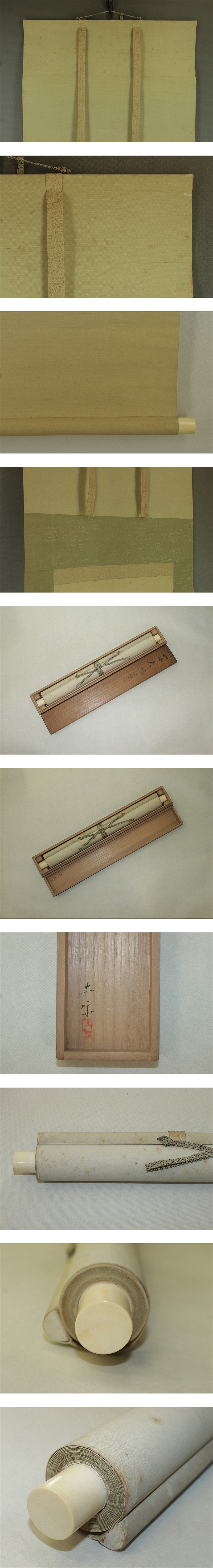 奥村土牛 おくむら-とぎゅう(1889-1990) 大正-昭和時代の日本画家。 明治22年2月18日生まれ。38年梶田半古に入門,のち同門の小林古径に学ぶ。 昭和2年院展で「胡瓜畑」が初入選,11年帝展で「鴨」が推奨第1位となる。 22年芸術院会員。37年文化勲章。53年日本美術院理事長。 東京芸大,武蔵野美大などで教えた。平成2年9月25日死去。101歳。 東京出身。本名は義三。 本紙は、染み、汚れ、折れ、軽い皺があります。 表装は、染み、汚れ、軽い折れ、皺、虫食、ほつれ、軸先に少し汚れがあります。 【サイズ】 作品 横約33.5cm×縦約110cm 表装 横約47cm×縦約197cm |