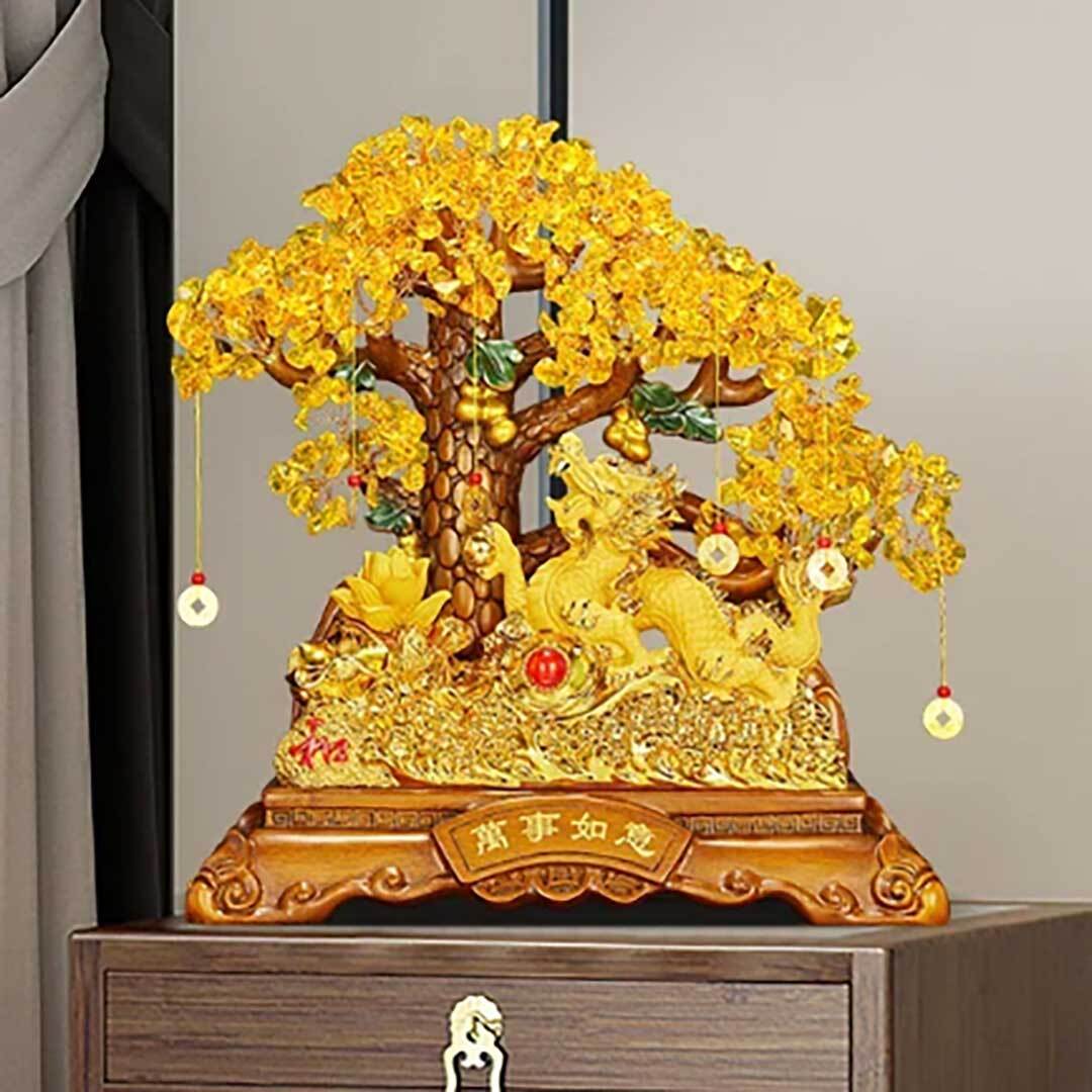 風水 龍の黄金木 大サイズ 招財樹 金のなる木 置物 シトリン 蓮 龍 ドラゴン 天然石 インテリア 風水アイテム 金運アップ 財運 金運