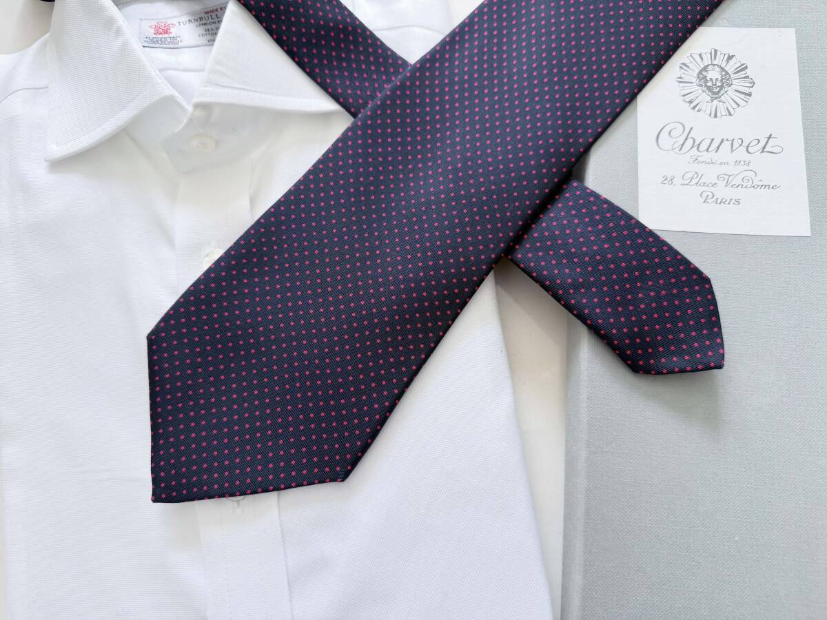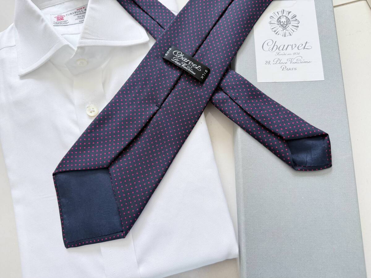 ご覧くださりどうも有り難うございます、Charvet シャルベ のエレガントなネイビー ピンドット シルク タイ 新品未使用、未着用です。すべてのタイの元になった最もオーセンティックな商品です。
