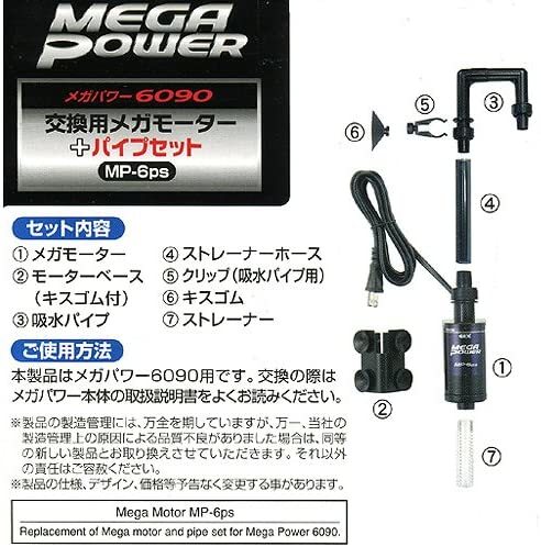 • セット内容:メガモーター、モーターベース(キスゴム付)、吸水パイプ、ストレーナーホース、クリップ(吸水パイプ用)、キスゴム、ストレーナー