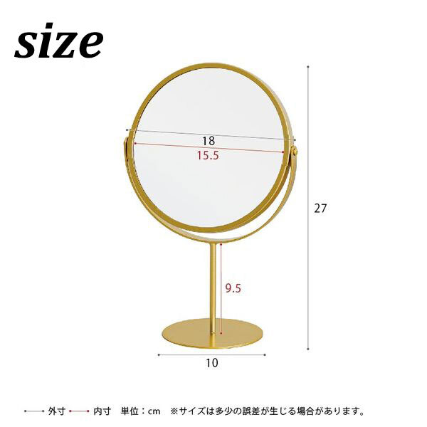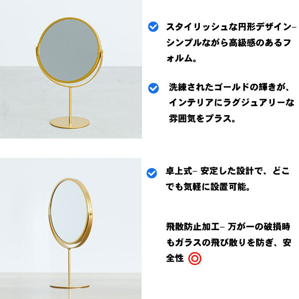 | 商品説明 | 洗練されたデザインと実用性を考慮したの卓上ミラー。 ゴールドカラーのフレームが上品な雰囲気を演出し、インテリアにも美しく眺めます。 この卓上ミラーは、等倍鏡と3倍鏡の両面仕様で、用途に応じて使い分けが可能です。 幅18cm×高さ27cmで、ドレッサーやデスクに最適。 安定した設計で、どこでも気軽に設置可能。 万が一の破損時もガラスの飛び散りを防ぎ、安全性。 完成品でのお届けです。 |