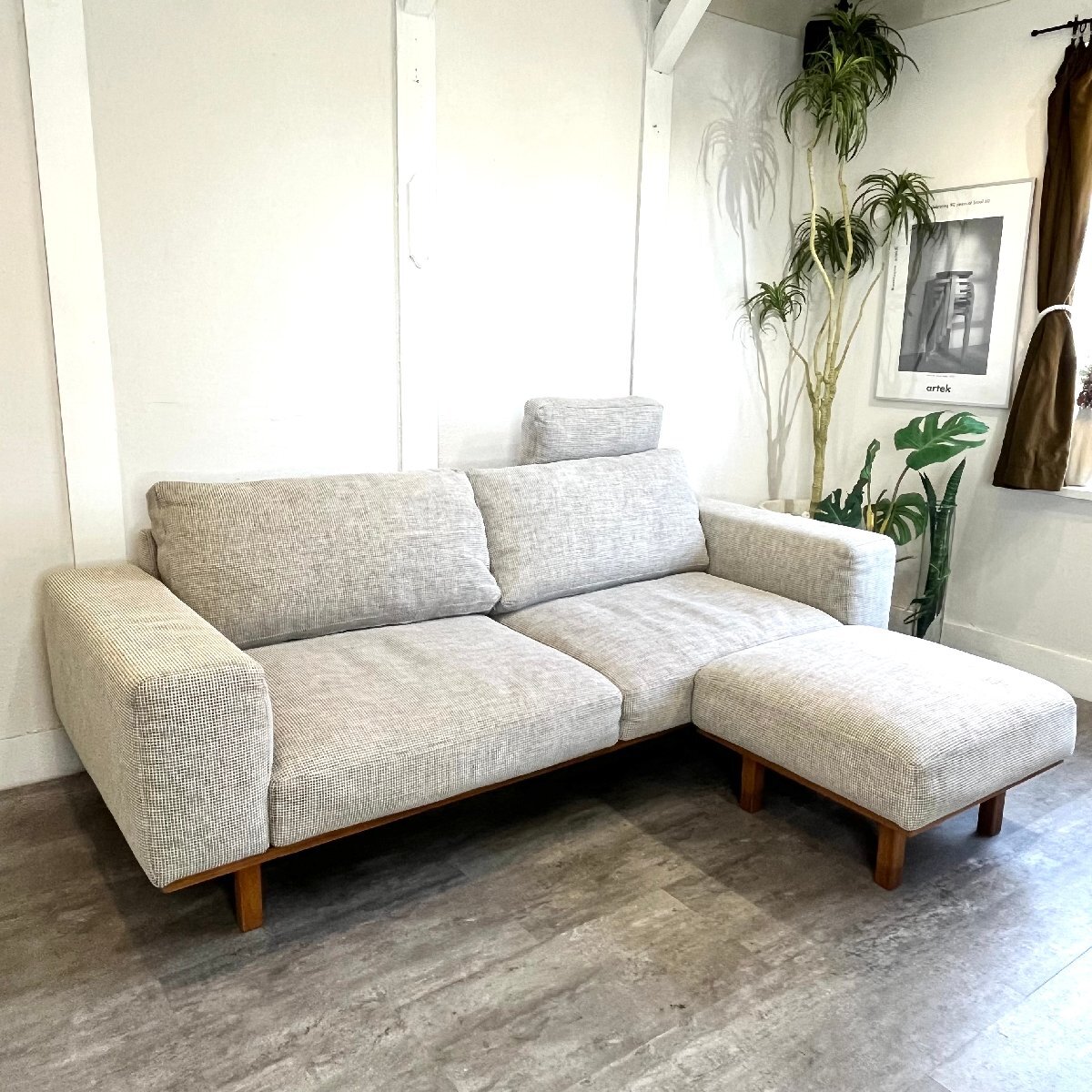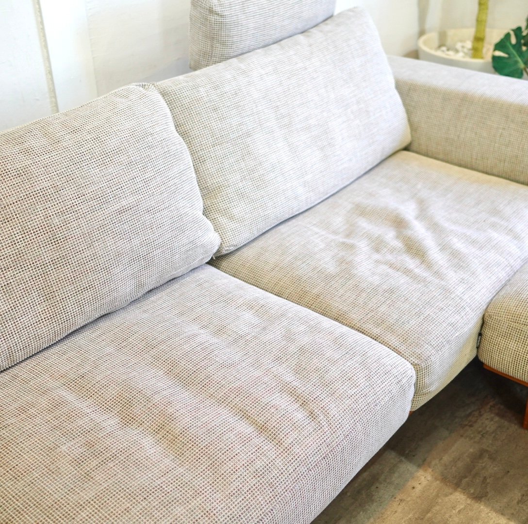 カリモク / karimoku UU22 2Pソファです。オットマンとヘッドレストが付いています。 ザ・ソファといったシンプルなデザインとカラーが素敵なソファ。 様々なお部屋にすんなりマッチ◎ 「"ふわっ"と感じて"じわっ"と沈み込む心地よさ」カリモクHPに載っていた、UU22ソファのキャッチフレーズ。まさにその通り! たっぷりのフェザーと3種類のウレタンを使い分けて、絶妙なクッションを実現したソファ。アーム部分もむっちり柔らかい。 ヘッドレストはちょうどいい硬さで頭を支えてくれます。ソファでのうたた寝が増えちゃいそう! ファブリックはカバーリング式で取り外してクリーニングできます。横糸がカラフルで、遠目に見た雰囲気と近くで見た印象が変わるのも面白いかも。 家族が集うリビングにぴったり。 早い者勝ちですよ♪