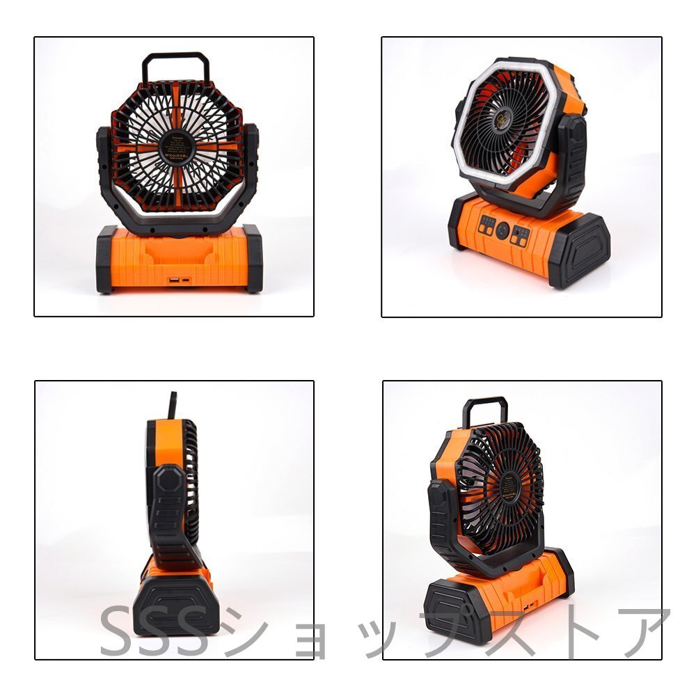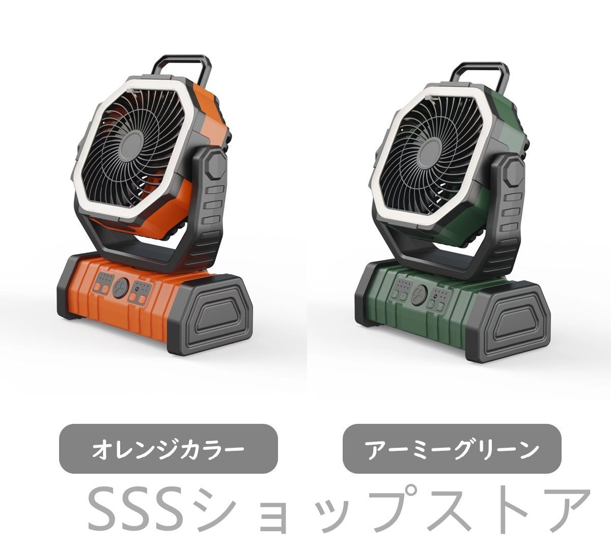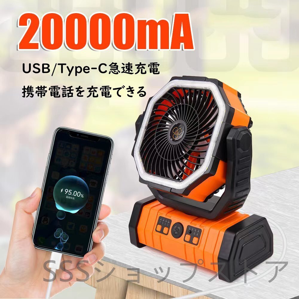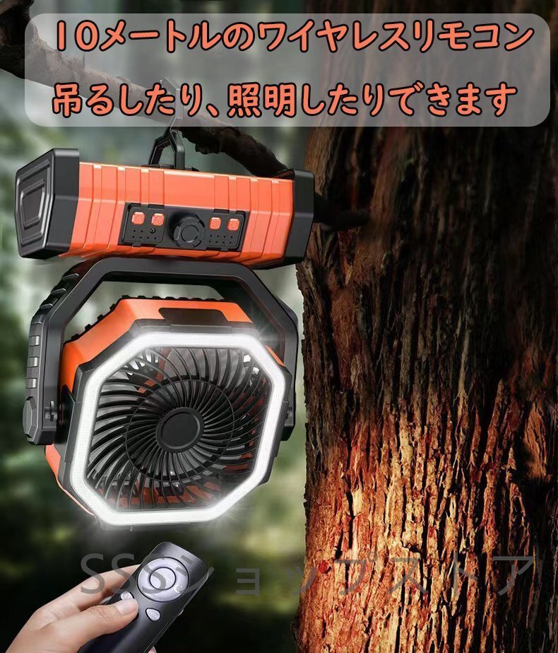 扇風機 ファン アウトドア 20000mAh 大容量 充電式 LEDライト 自動首振り 吊り下げ 卓上 小型 リモコン付き タイマー キャンプ オレンジ