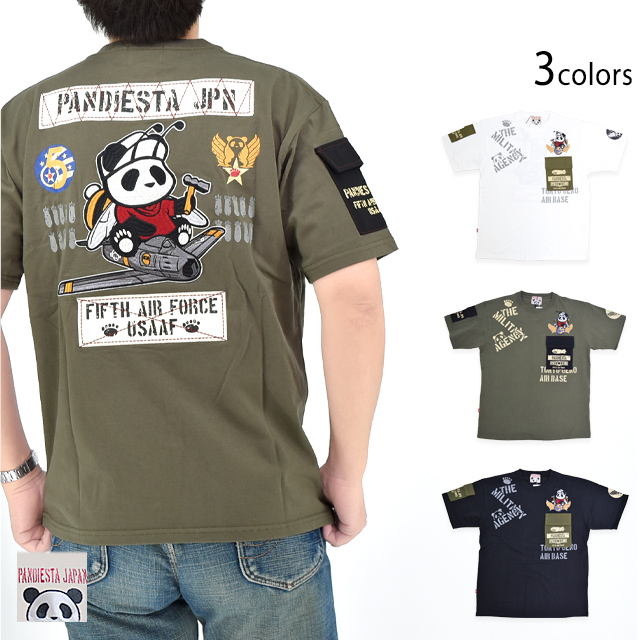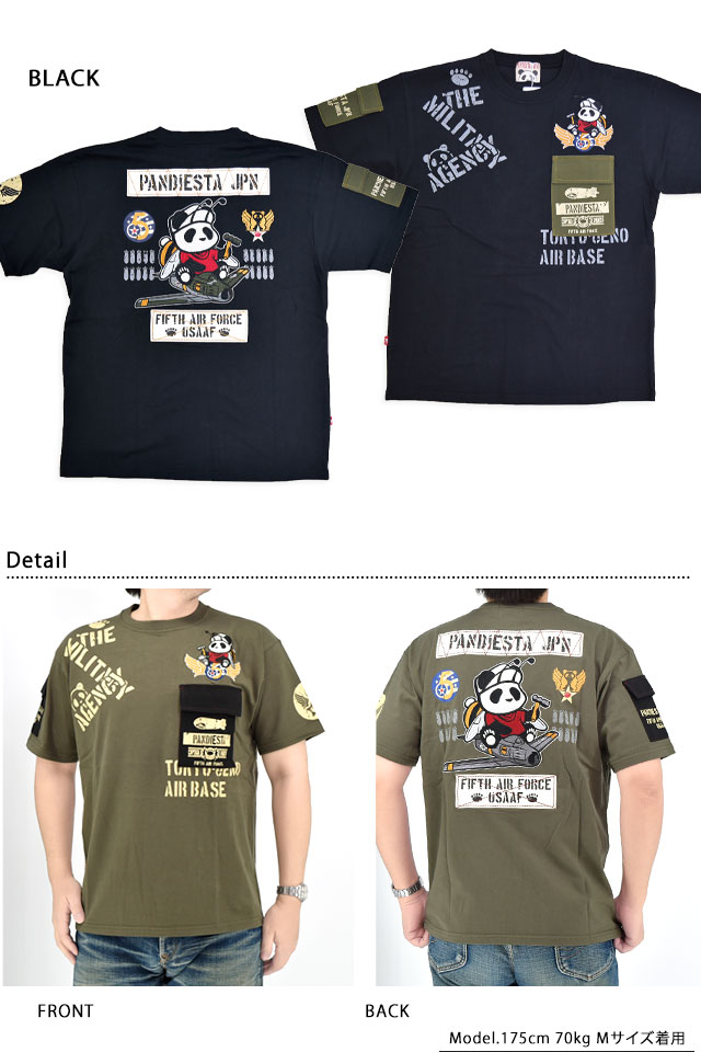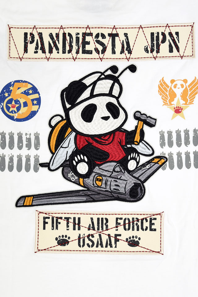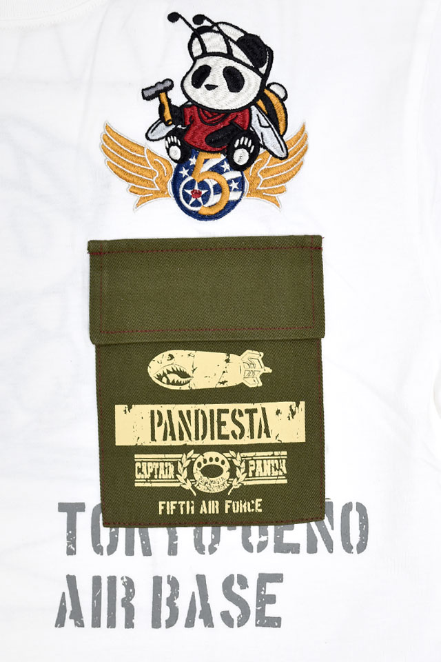 和柄ブランド【錦】の姉妹ブランドとして誕生した、お茶目なパンダをモチーフとした【PANDIESTA JAPAN】より「5TH AIR FORCEツイル切替半袖Tシャツ(585850)」のご紹介です。 今や、錦の定番モチーフとなった「錦PANDA」!! 今回は人気のミリタリーシリーズから新作が登場しました。 フロント左胸にはフラップ付きのポケットが縫い付けられており、表面にはミサイルとボックスロゴをプリント。 ポケット上部には蜂に扮したパンディエスタを刺繍しました。 バックには戦闘機に跨るビーパンダを刺繍。 絵柄上下のワッペンのみ、別生地での切替となります。 左袖にはエンブレムをプリントし、右袖にはフラップ付きのポケットを縫い付けました。 ボディーには、綿100%のしっかりとしたTシャツ生地を採用しています。 | |||||||||||||||||||||||||
