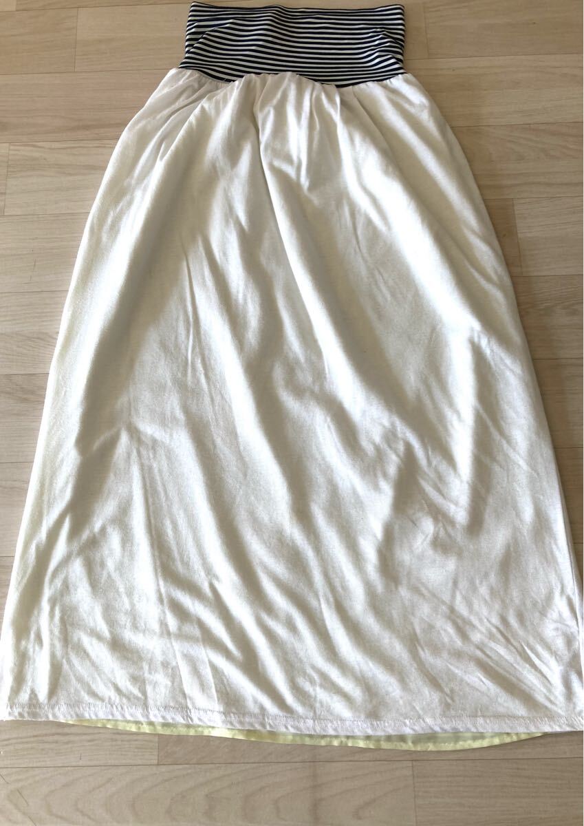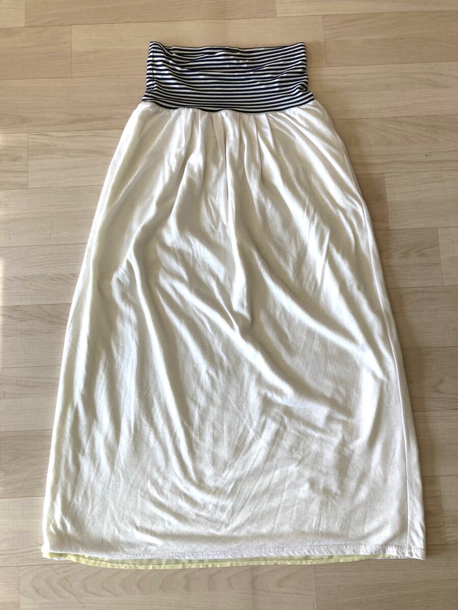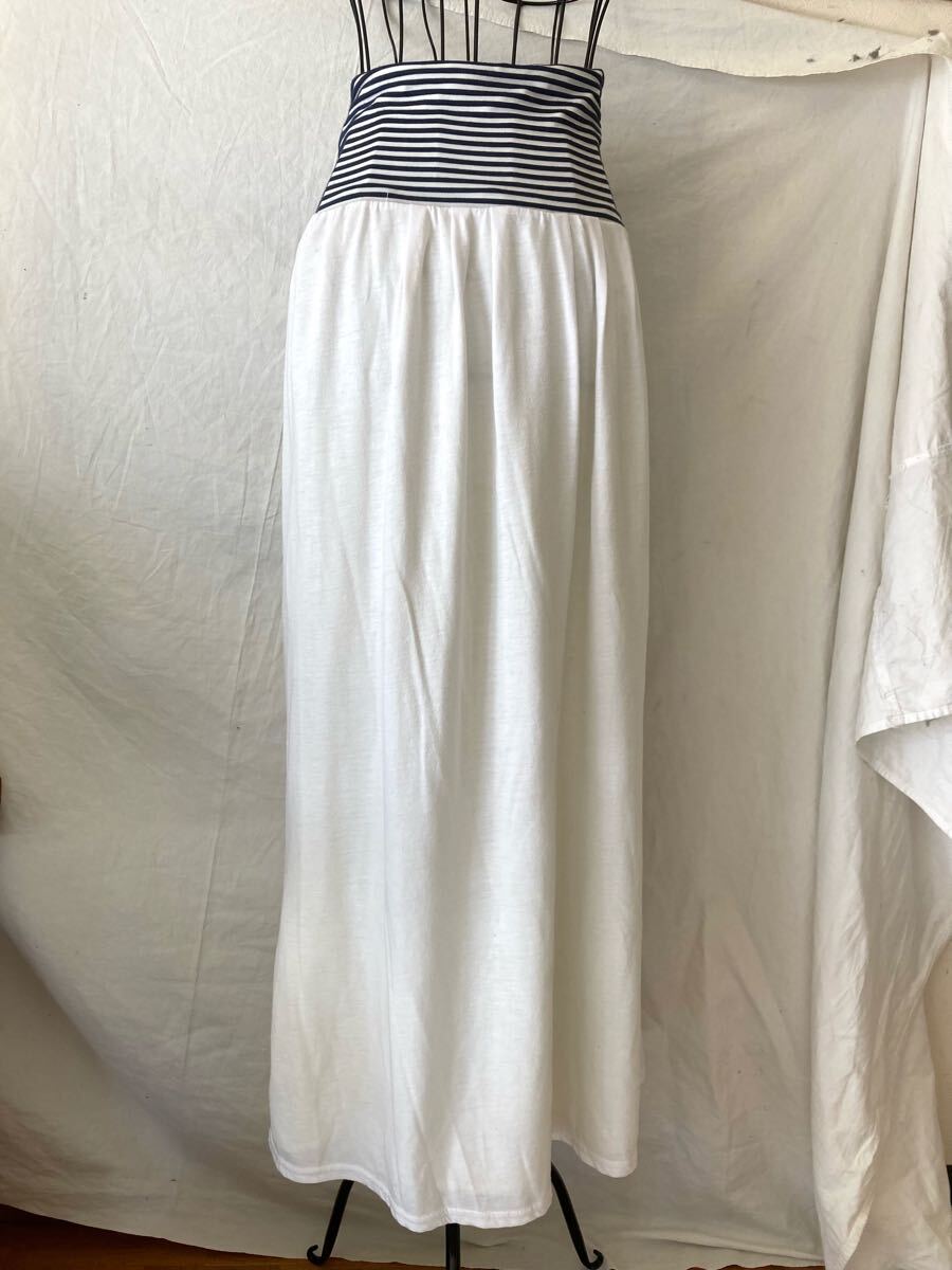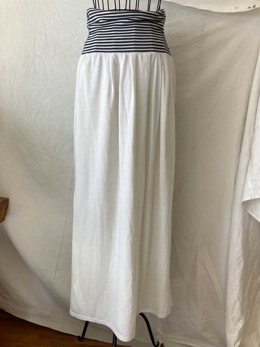 LHELBIE ストライプバンド付きのホワイトロングスカート、柔らかい生地でフレアシルエット。