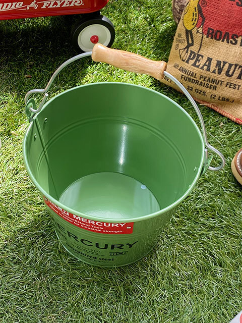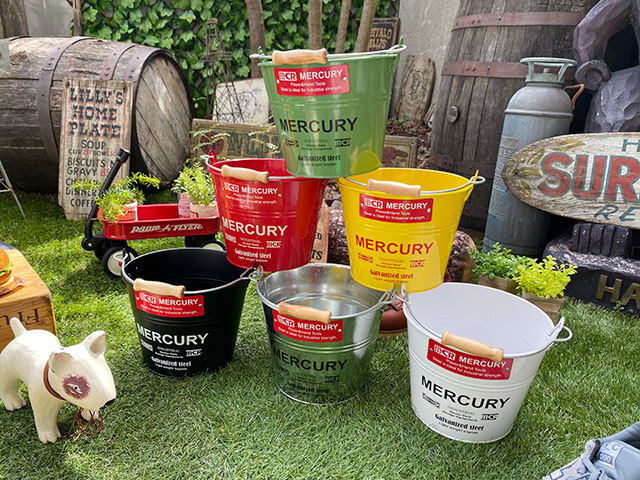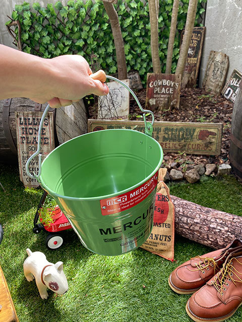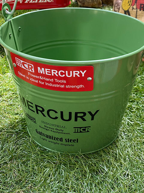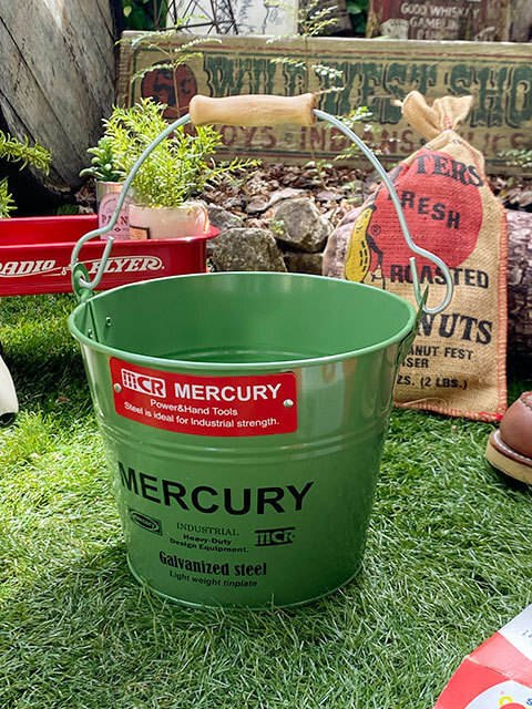 使い込んで行くうちに小傷や凹みなどで年期が入ってくると、そのヤレた雰囲気がまたカッコイイ味わいになるのがマーキュリーバケツの楽しみでもあります。