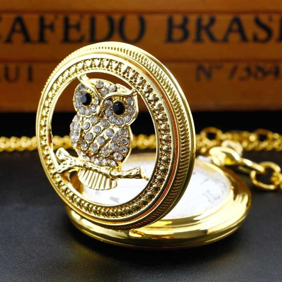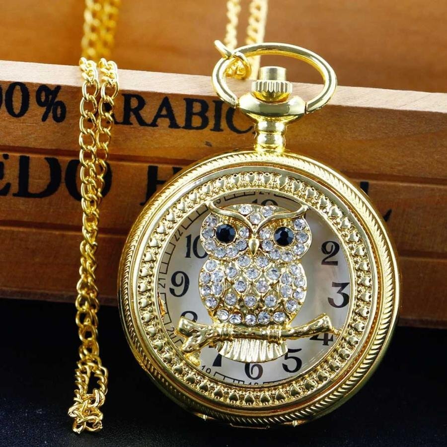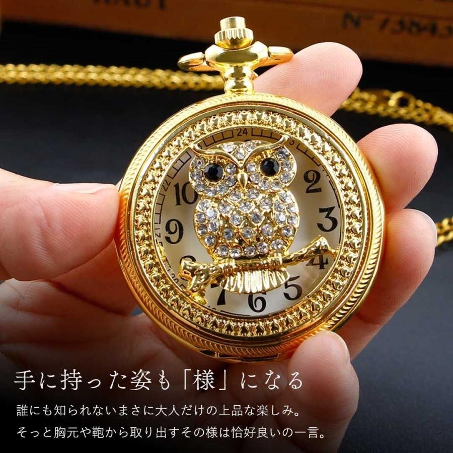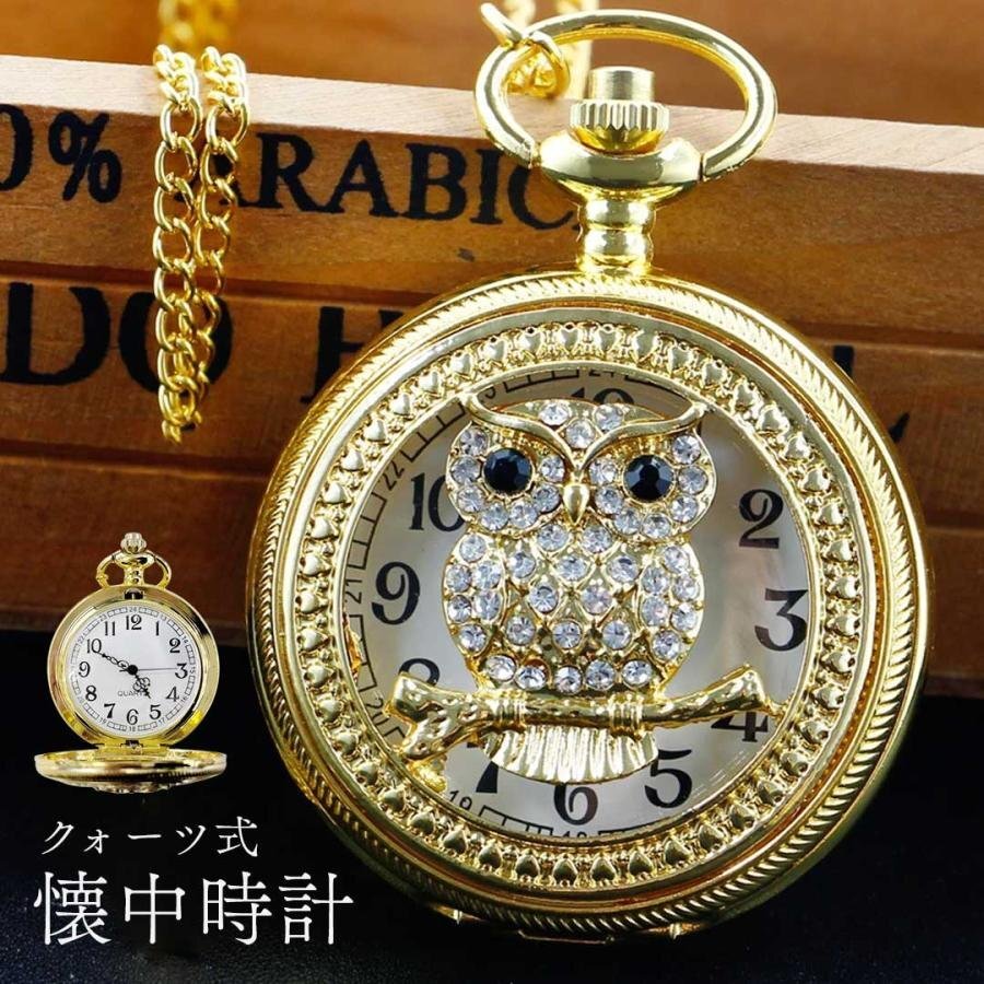 懐中時計 木に止まる一羽の梟 ラインストーン ゴールド アンティーク風 チェーン付き 高耐久性 文字盤 メンズ レディース