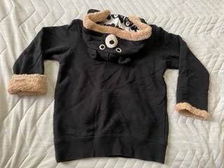 ブラック、胸にB君のお顔のアップリケ、ロゴのワッペン、フード内側はB