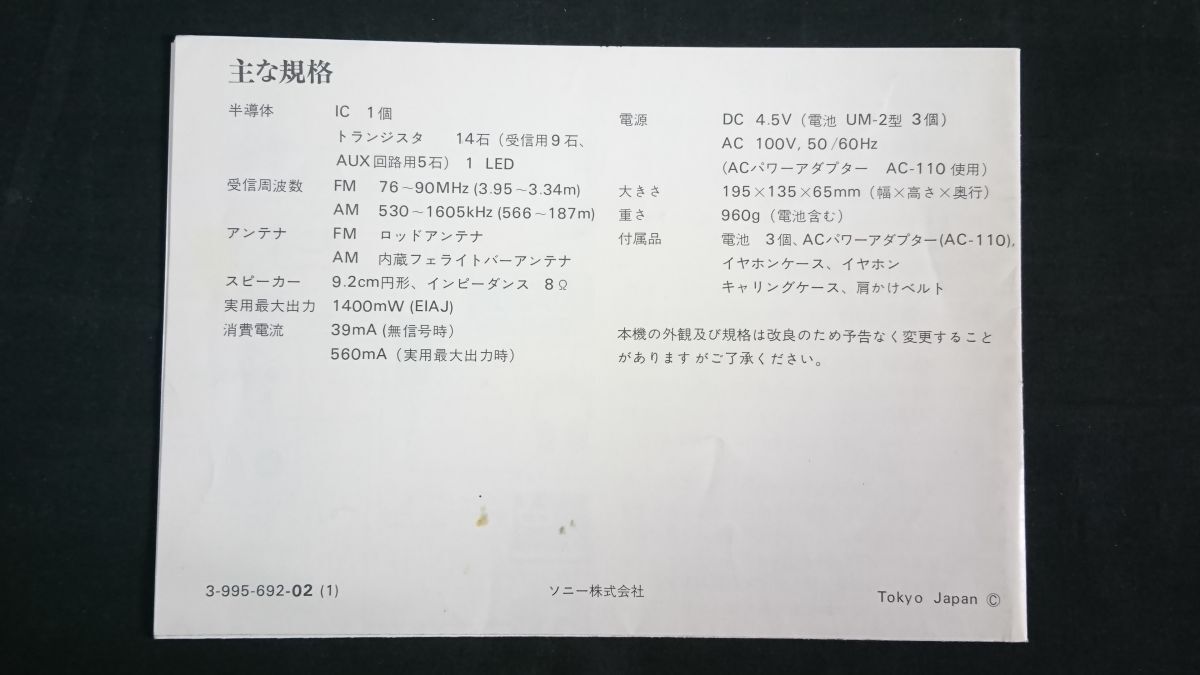 商品説明 | 中古品としての出品です。 【昭和レトロ】 『SONY(ソニー) FM/AM 2バンド ラジオ Time in Matic ICF-5250 使いかた(取扱説明書)』 昭和49年頃 ソニー株式会社 ●使いかた(取扱説明書)のみの出品になります。 ●使用感や擦れ、シミ、キズなどございます。 ●書き込みは、ございません。 ●商品は、付属品も含めて、画像に写っている物がすべてです。 | ||