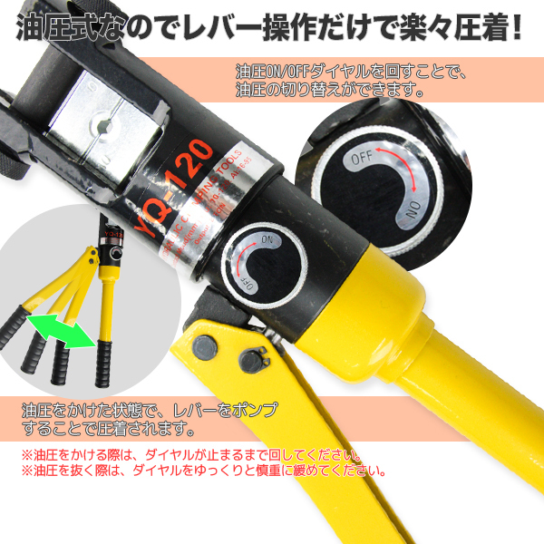 大口径のケーブル先端に圧着端子を取り付ける油圧式圧着工具です。