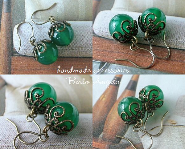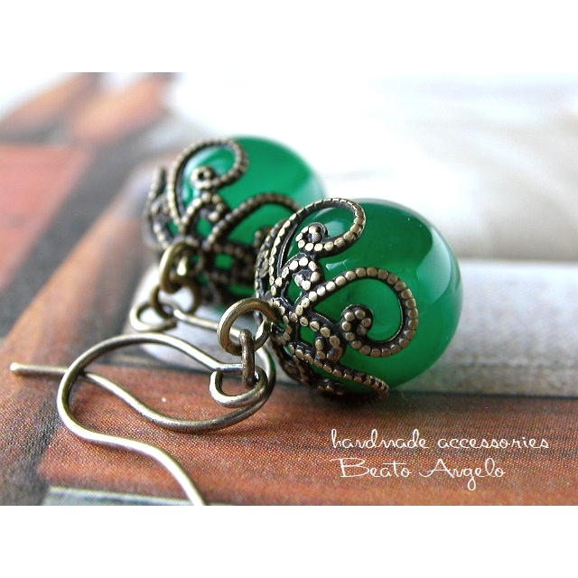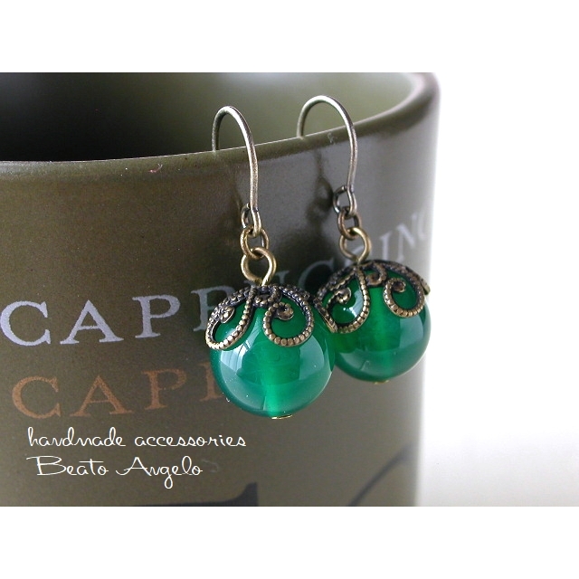 ■+angelo+高品質★天然石緑メノウの一粒ピアス(p-001)AG 10mm 花座 金古美 グリーン アンティーク