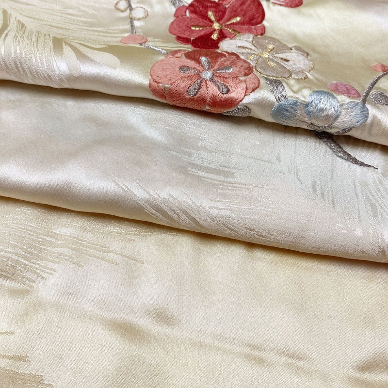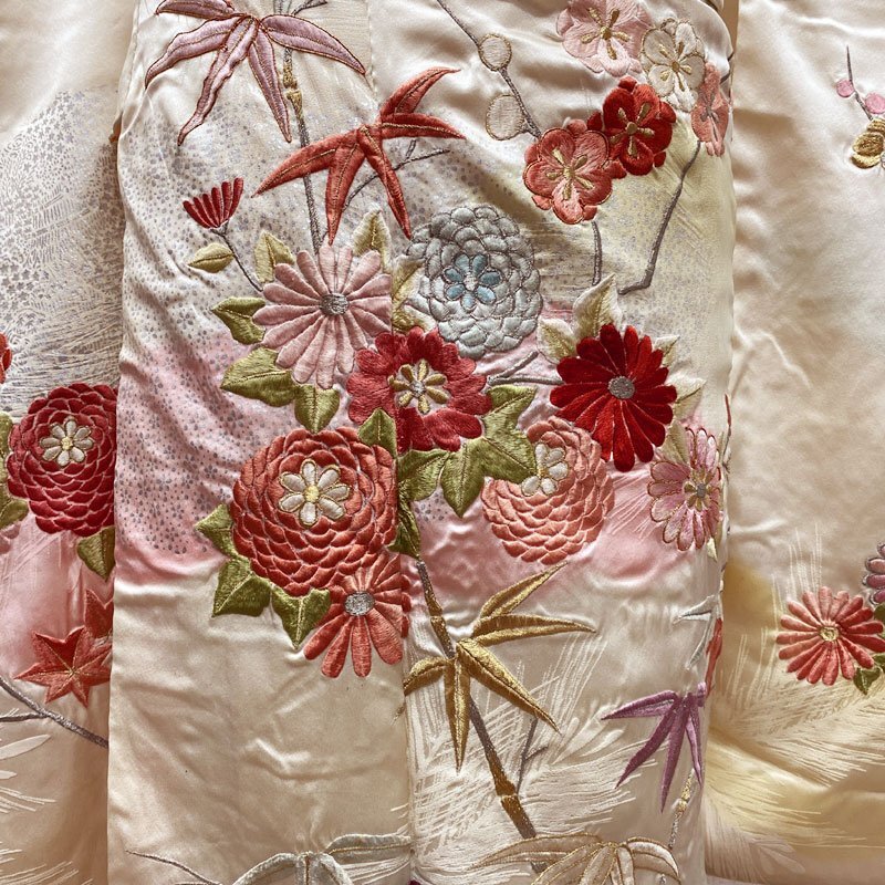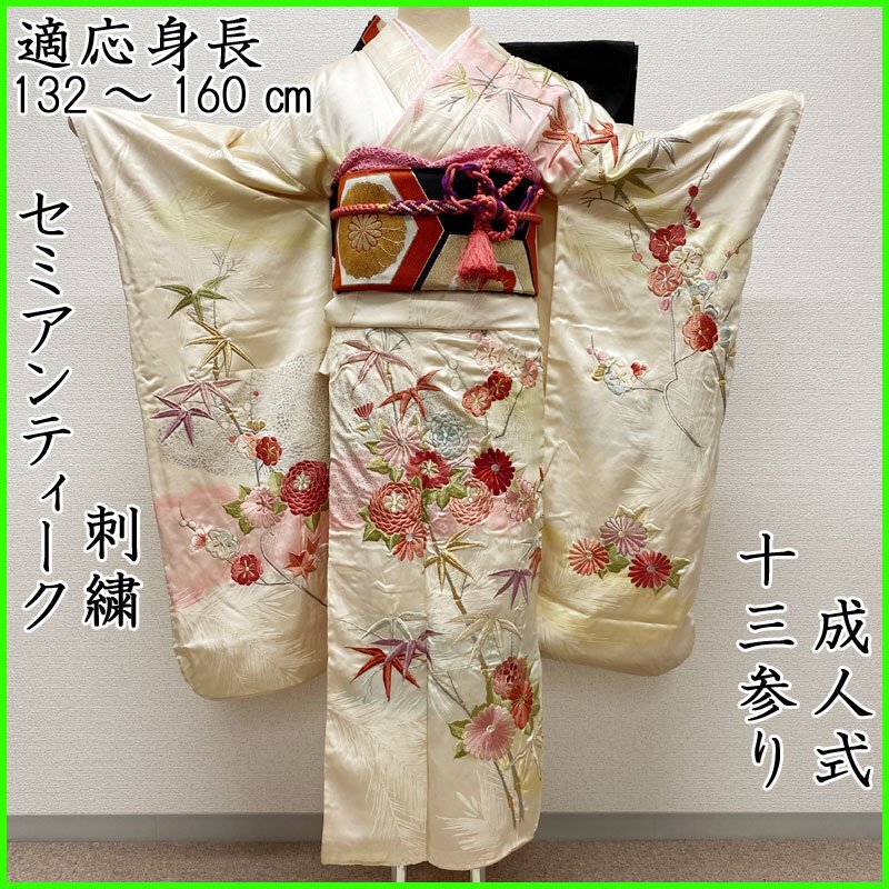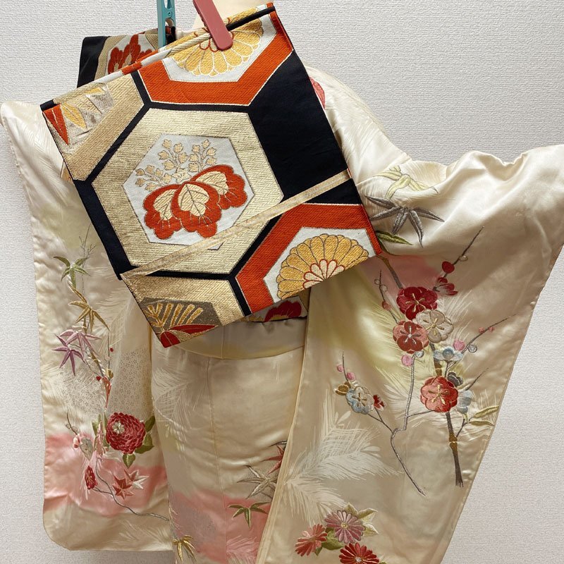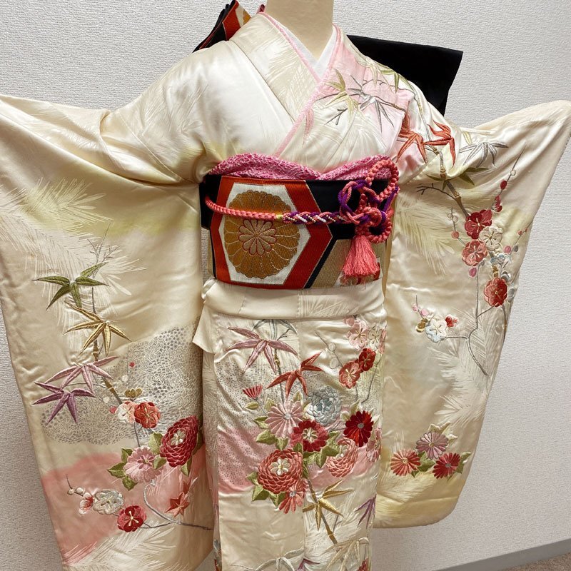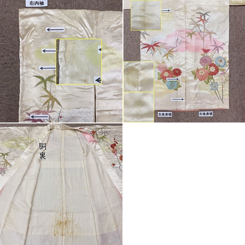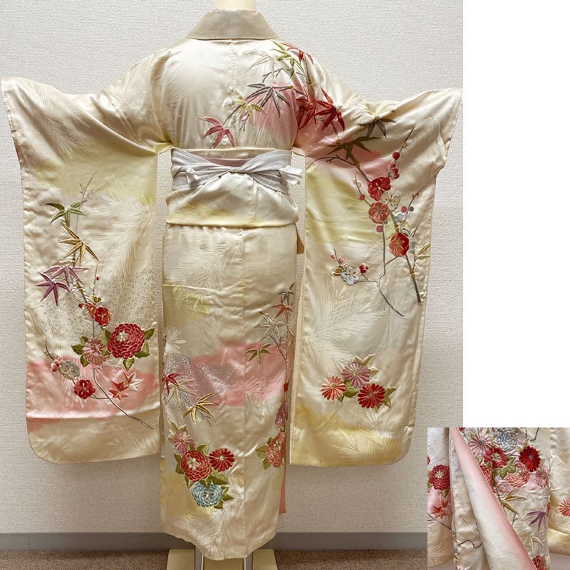 | ◎振袖&袋帯 セミアンティーク 刺繍 成人式 結婚式 十三参り オフホワイト◎ 光沢のある地紋が浮かび上がるオフホワイトの地に、刺繍で施された梅、竹、菊文様が素敵なセミアンティーク振袖です。金駒刺繍、金銀糸、銀彩が施されております。こちらの商品は振袖、袋帯です。お小物類(帯揚げ、帯締め、重ね衿)は+4000円です(その他の小物は私物になります)。 (振袖)画像以外にも薄いシミや小さなシミがございますが、画像のように近くで見ないとわからない程度です。内側胴裏、八掛にシミがございますが、内側なので見えません。セミアンティークの風合いとお考え下さい。 (帯)特にシミ・ダメージなく美品です。未仕立て品ですが、このままご使用いただけます。 【素材】正絹 【色】オフホワイト *モニターによって色味は実際と異なる場合がございます。 【サイズ】