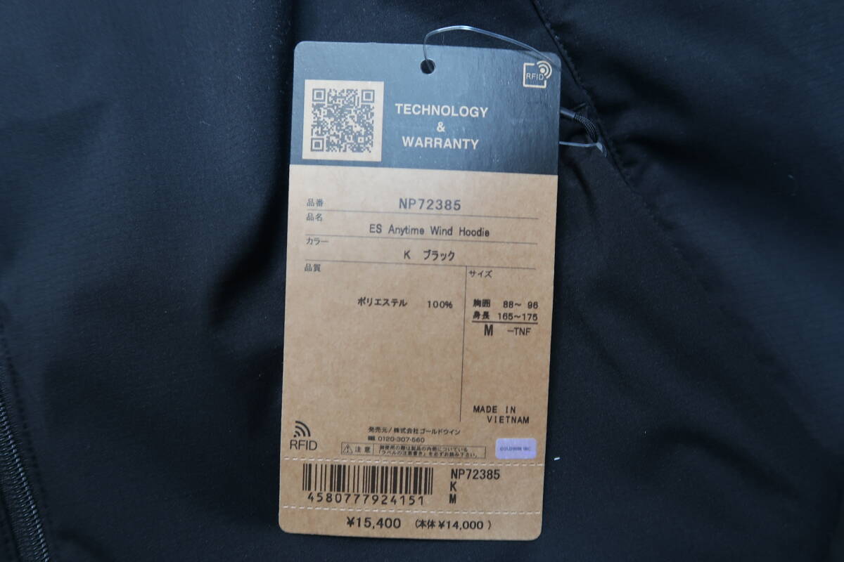 □ 新品 15400円 メンズ M ノースフェイス ES エニータイムウィンド フーディ 軽量 ウィンドブレーカー ジャケット 防風 UV 黒 NP72385