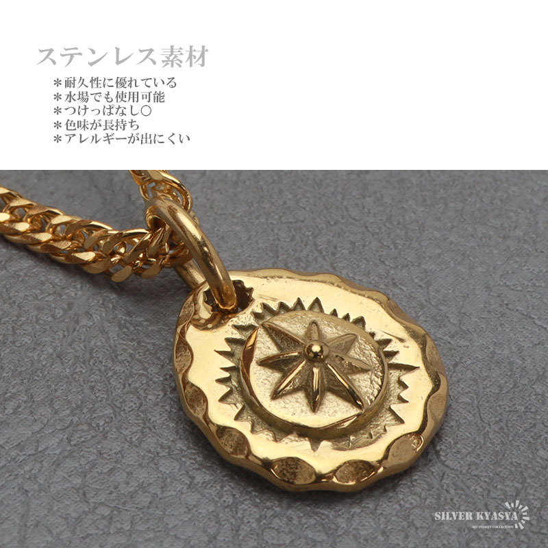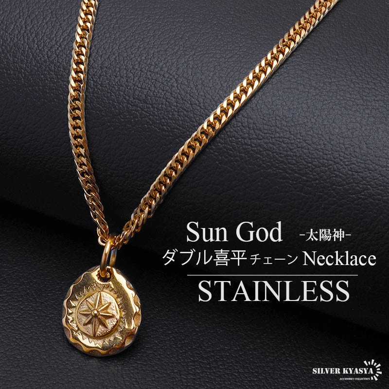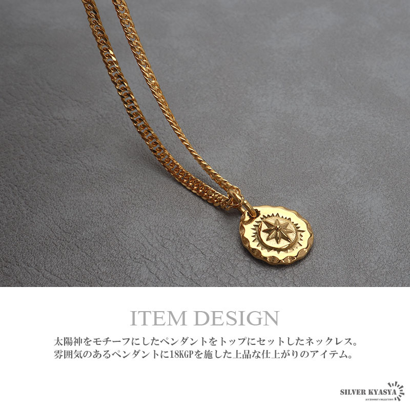 | 商品概要 | ■ITEM DETAIL 太陽神をモチーフにしたペンダントをトップにセットしたネックレス。雰囲気のあるペンダントに18KGPを施した上品な仕上がりのアイテム。 ■ステンレス素材を使用 金属部分は頑丈なことで知られるステンレス素材を採用。耐久性はもちろん耐水性も高く水場での着用も可能。金属アレルギーも出にくいとされている金属です。 |