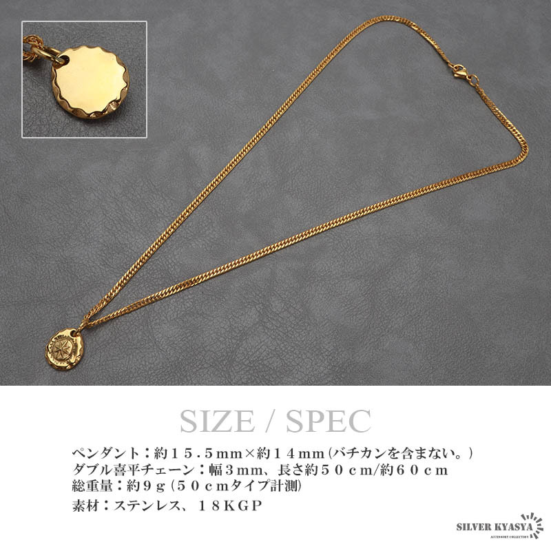 | サイズ | ペンダント:約15.5mm×約14mm(バチカンを含まない。) チェーン:幅3mm、長さ約50cm/約60cm (着用モデルは50cmタイプ) 重量:約9g(50cmタイプ計測) |