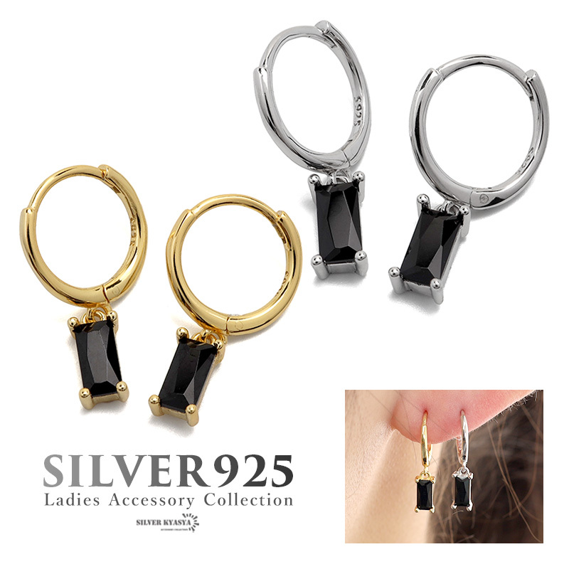 スクエア型のキュービックジルコニアが揺れるドロップピアス。ブラックストーンが耳元で静かに輝き、気品溢れるデザインに仕上げました。