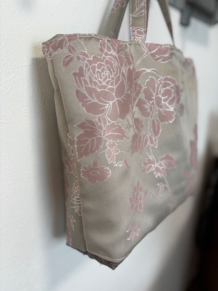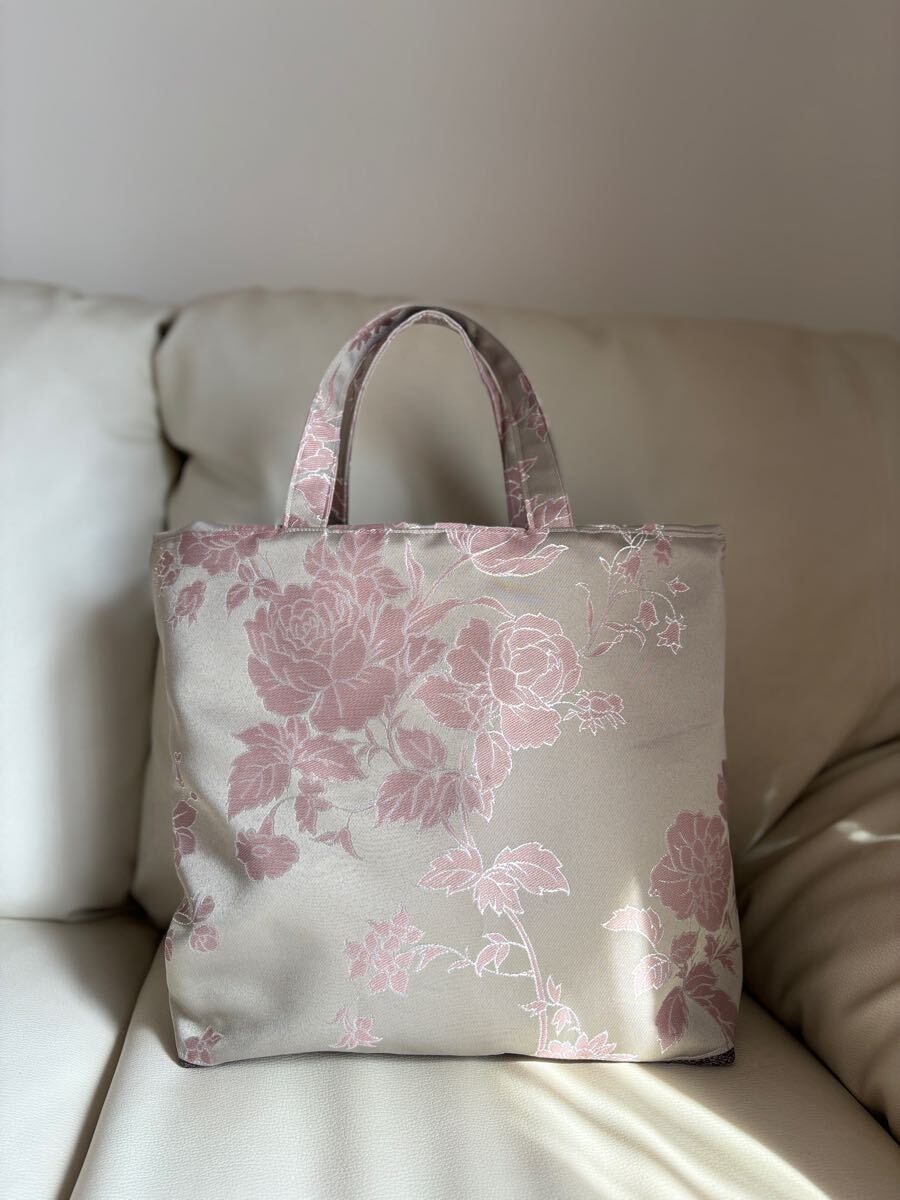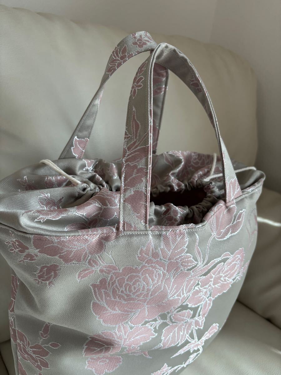 トート、シルバーグレイにピンクのバラのプリント、巾着蓋付 ハンドメイド