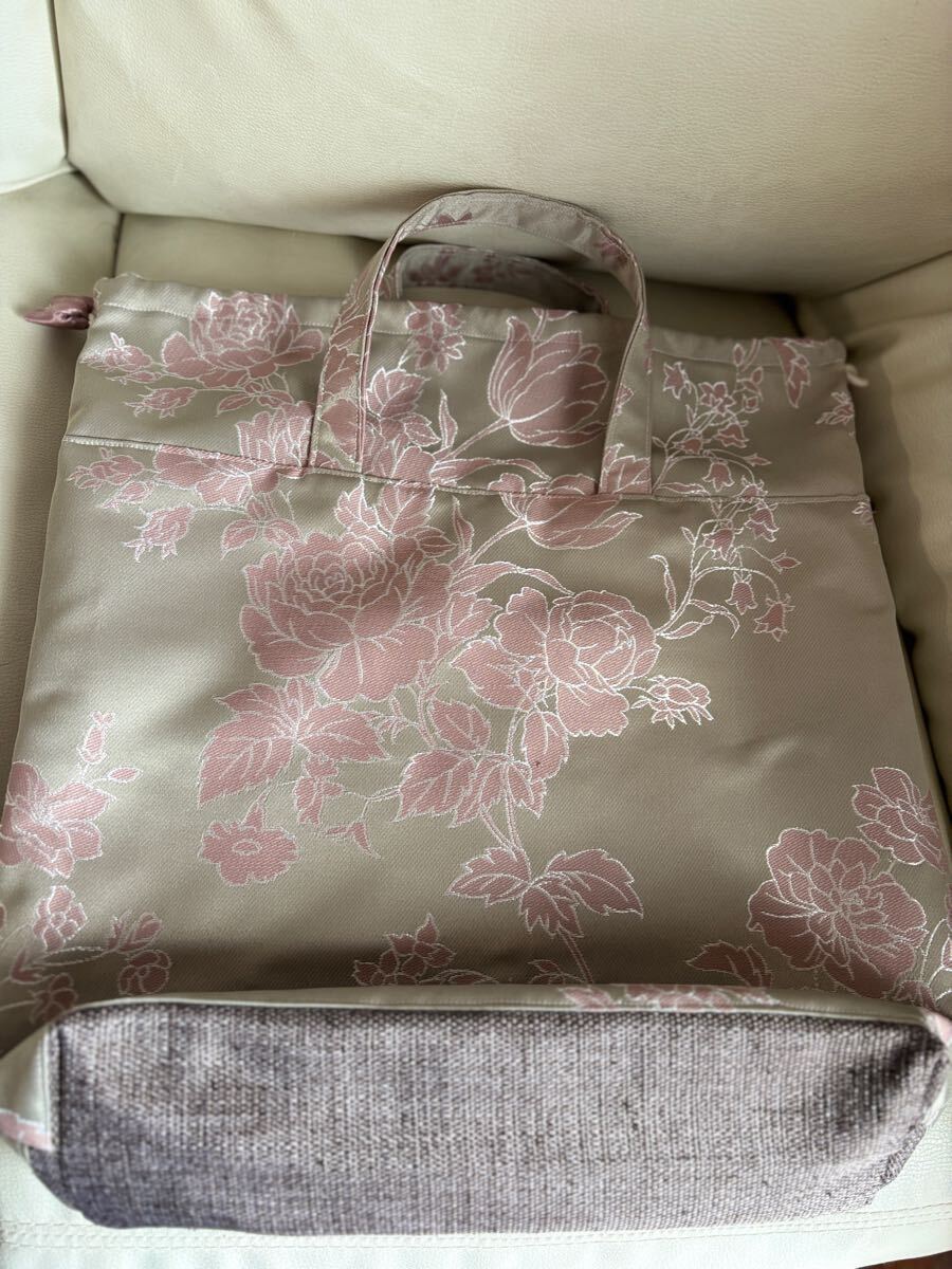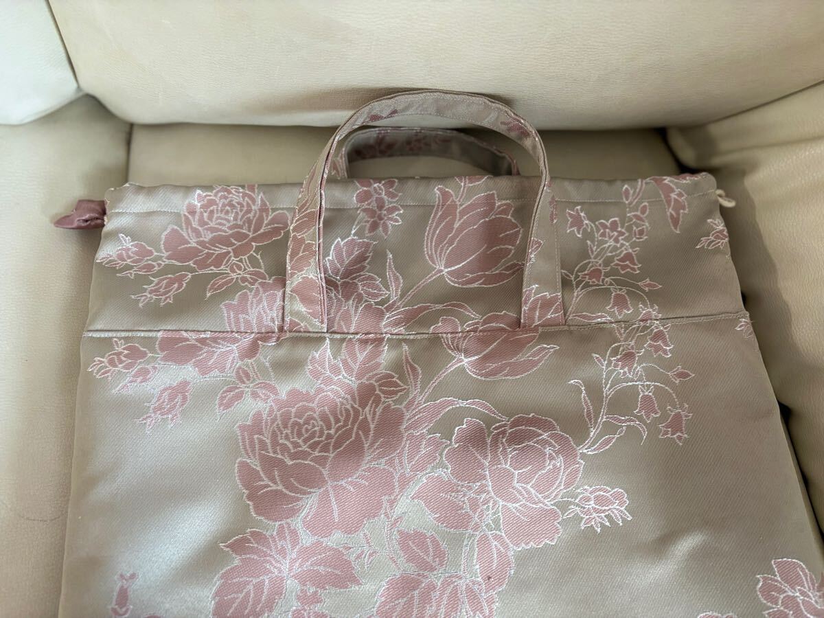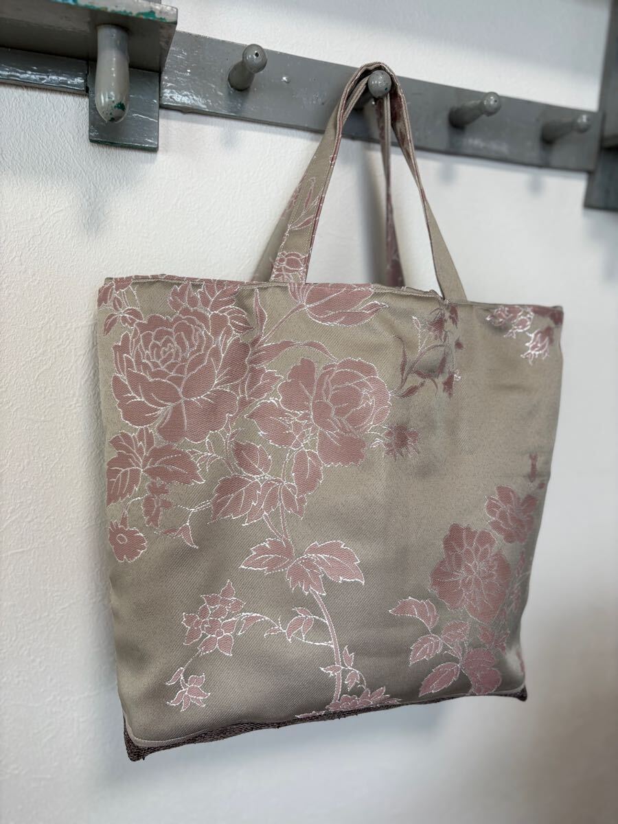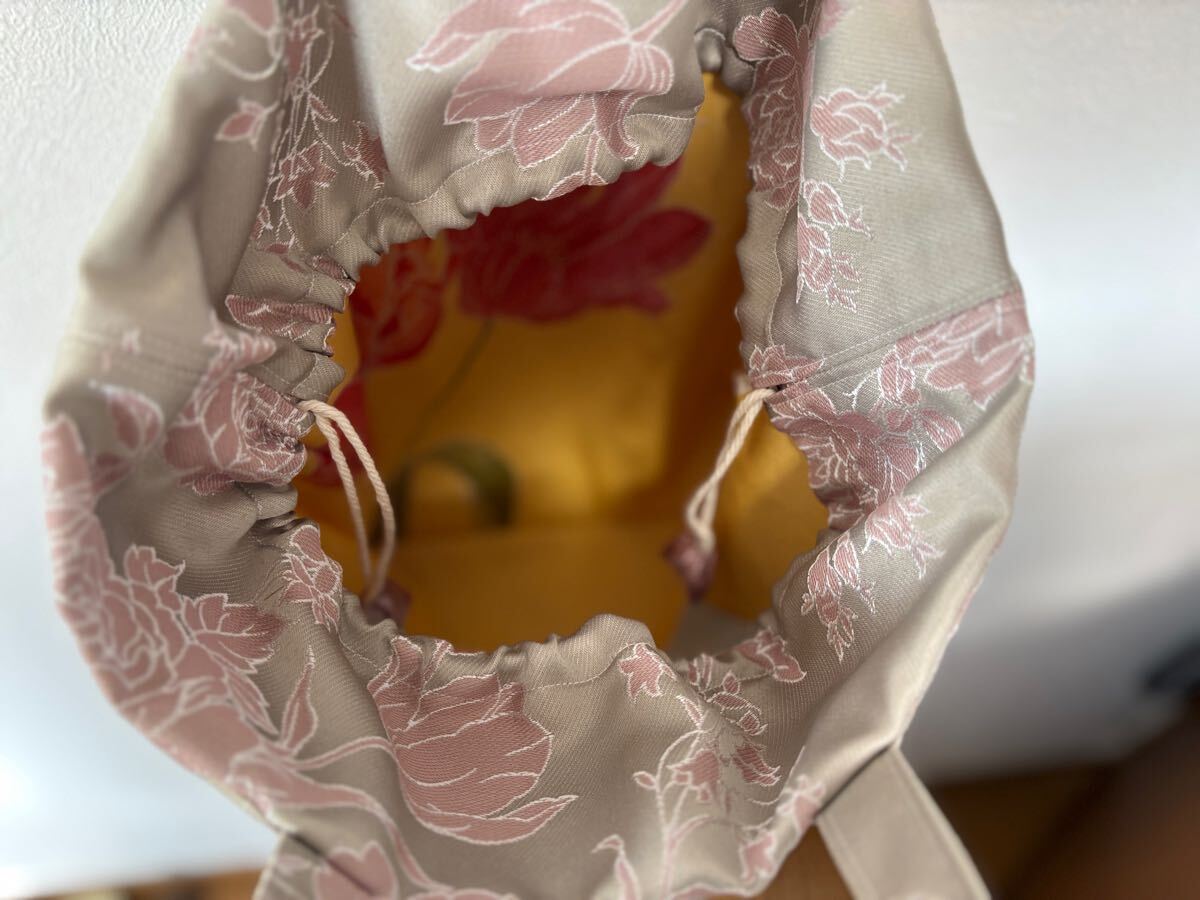 トート、シルバーグレイにピンクのバラのプリント、巾着蓋付 ハンドメイド