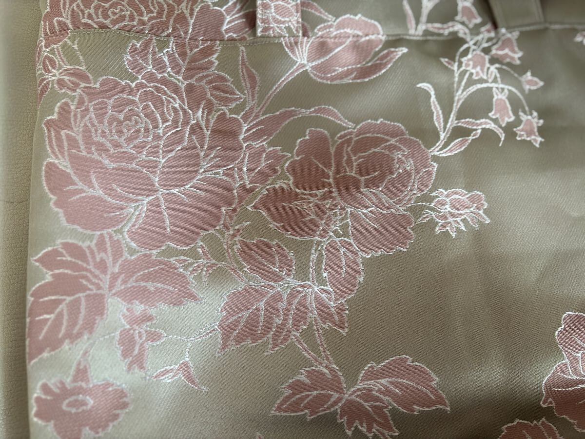 シルバーベースの生地にピンクのバラがプリントされた生地です。