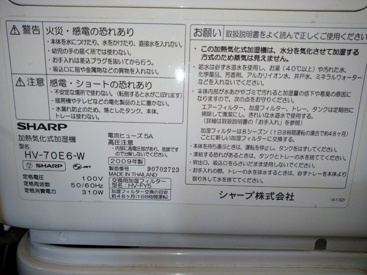 ◇【中古品】型名HV-70E6-W/加熱気化式加湿器 ② 製造年/2009年