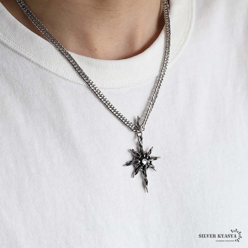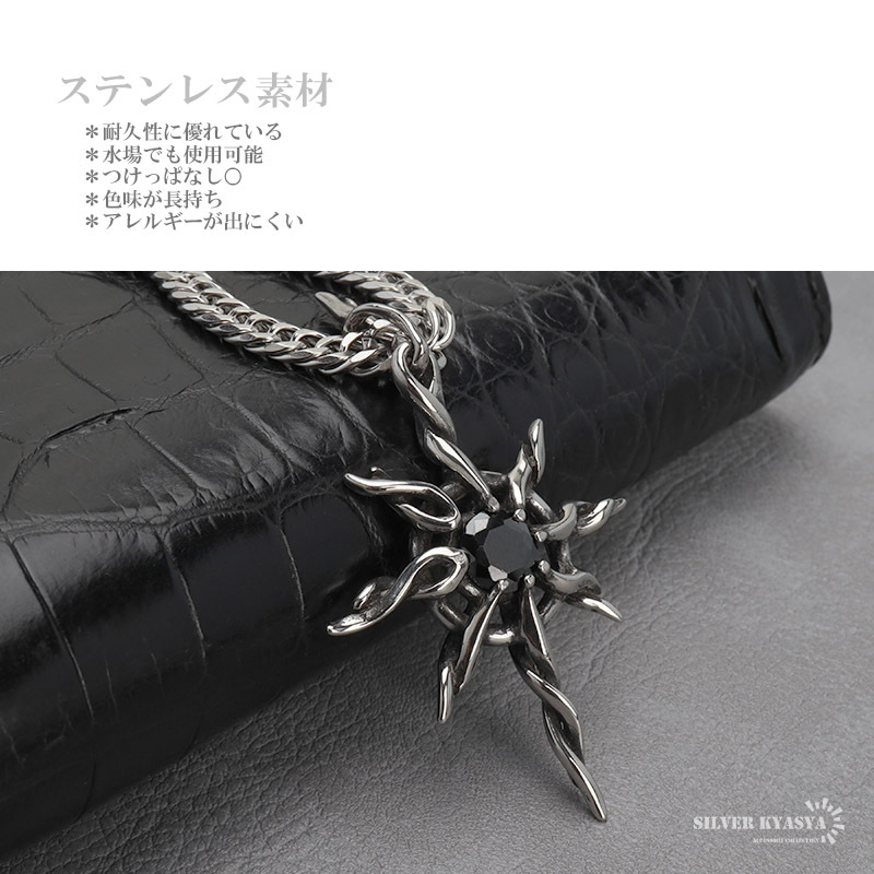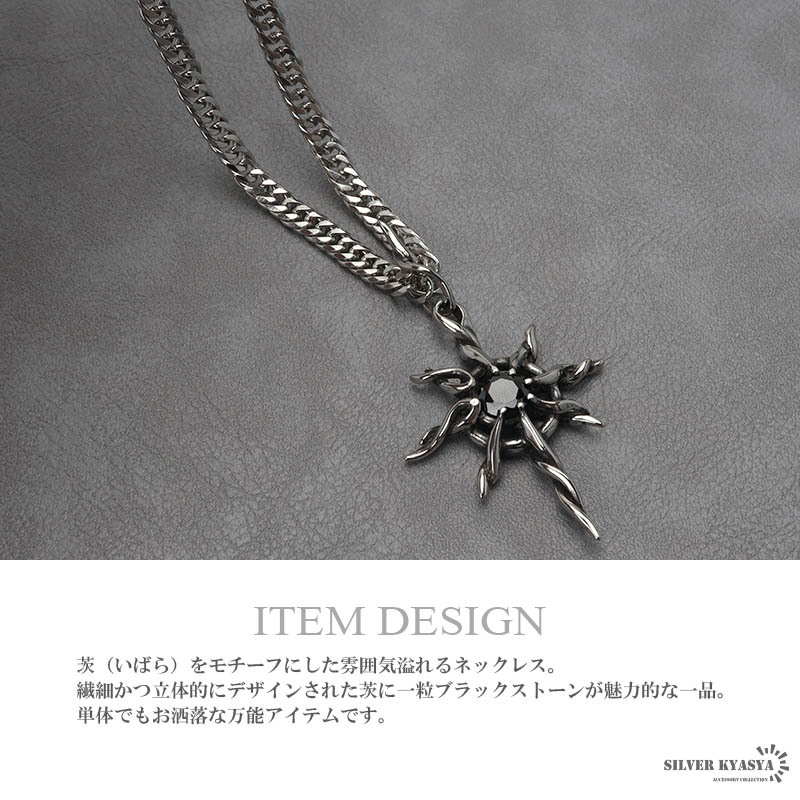 | 商品概要 | ■ITEM DETAIL 茨(いばら)をモチーフにした雰囲気溢れるネックレス。繊細かつ立体的にデザインされた茨に一粒ブラックストーンが魅力的な一品。単体でもお洒落な万能アイテムです。 ■ステンレス素材を使用 金属部分は頑丈なことで知られるステンレス素材を採用。耐久性はもちろん耐水性も高く水場での着用も可能。金属アレルギーも出にくいとされている金属です。 |