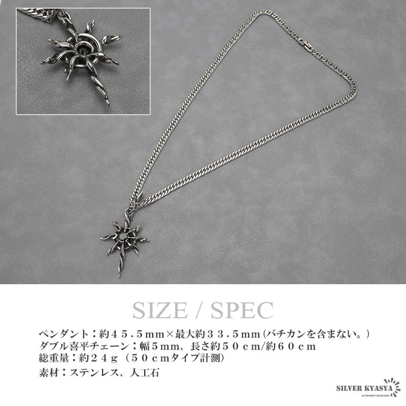 | サイズ | ペンダント:約45.5mm×最大約33.5mm(バチカンを含まない。) チェーン:幅5mm、長さ約50cm/約60cm(着用モデルは50cmタイプ) 重量:約24g(50cmタイプ計測) |