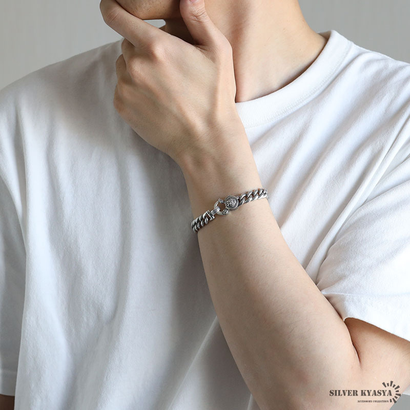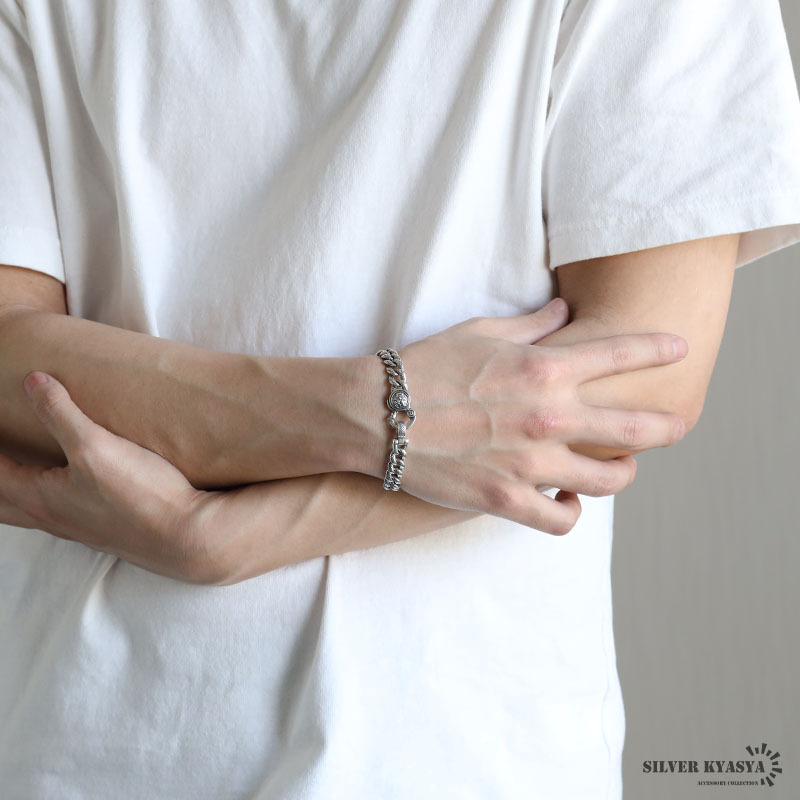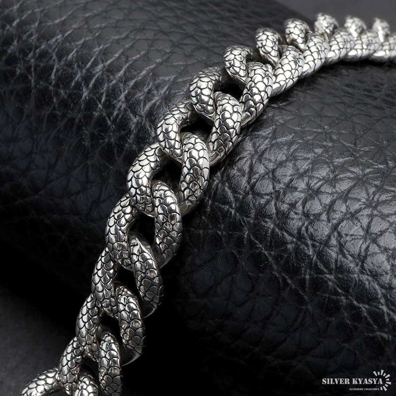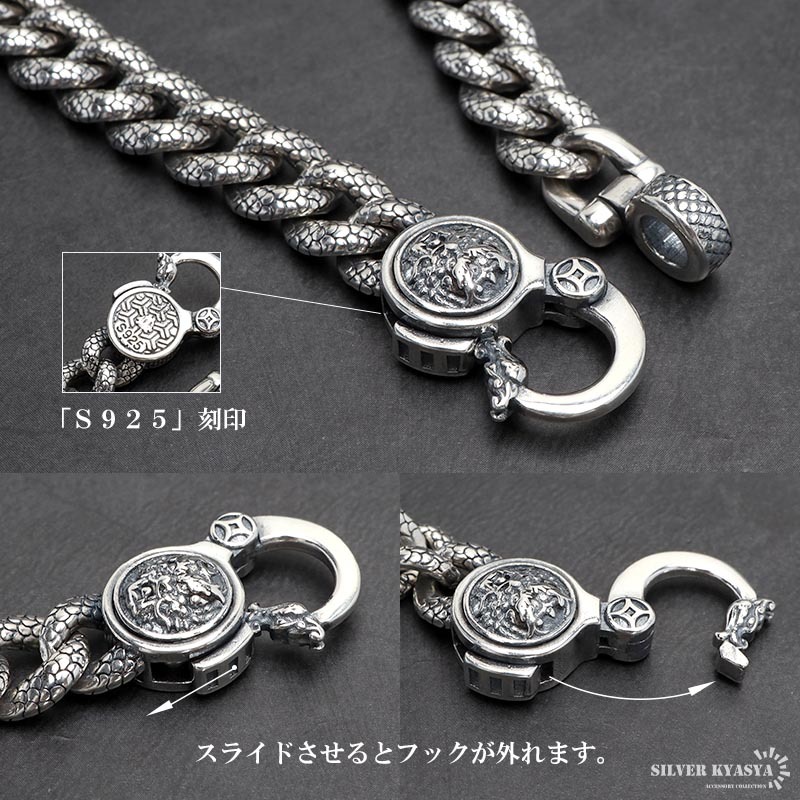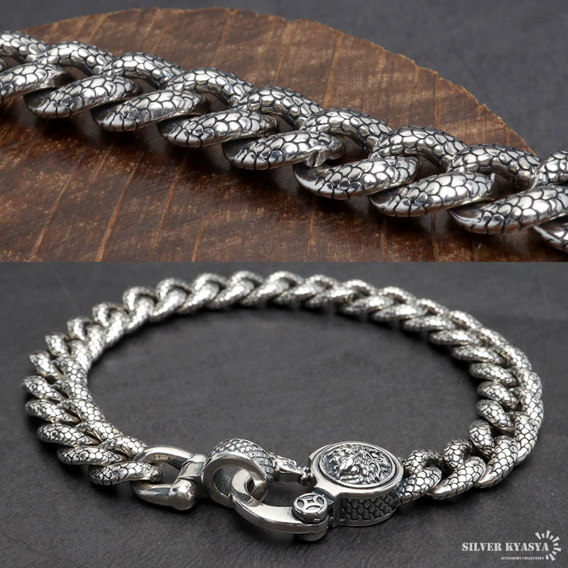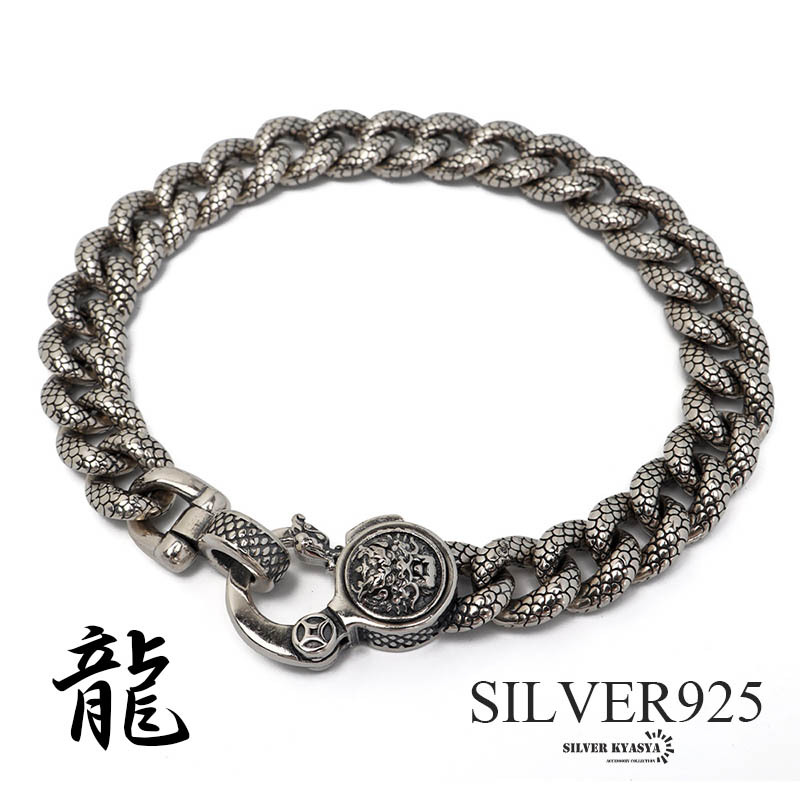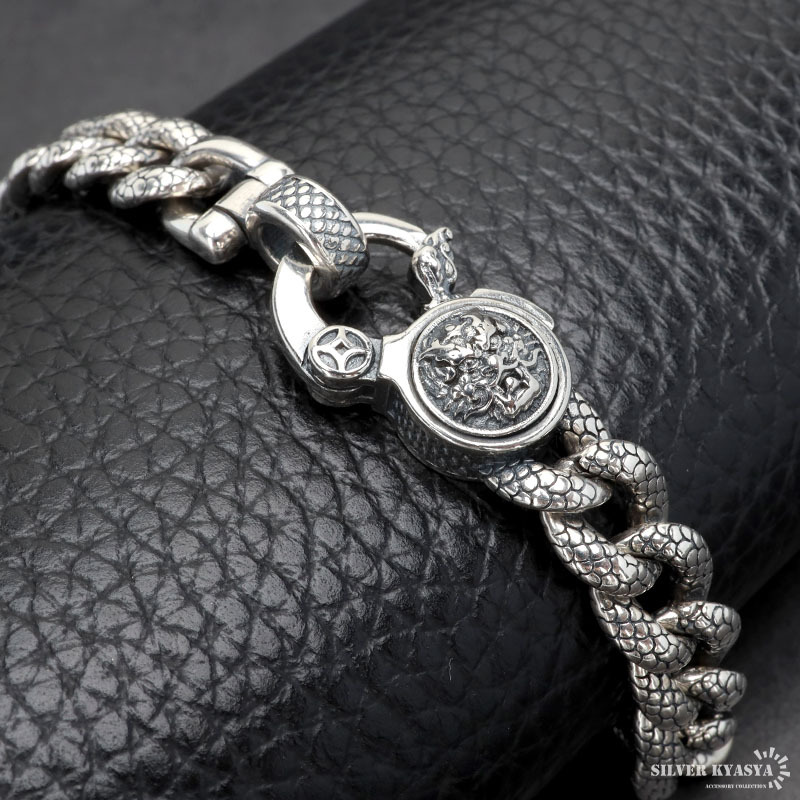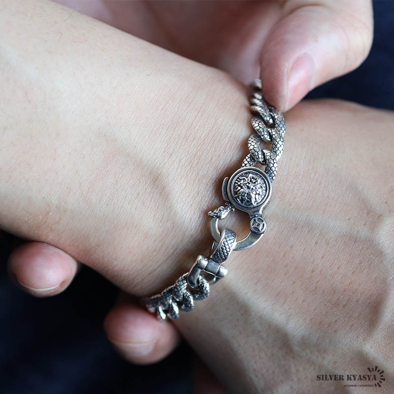 留め具に施されたドラゴンが迫力たっぷりのごつめブレスレット。喜平チェーンには龍の鱗模様を施し、お洒落な仕上がり。手元のアクセントに最適なアイテム!