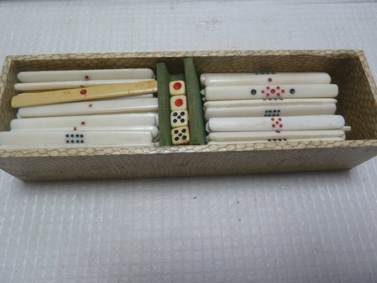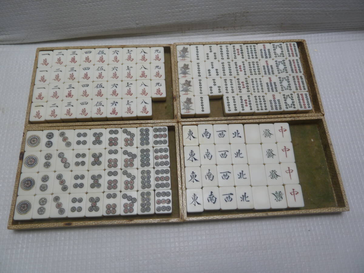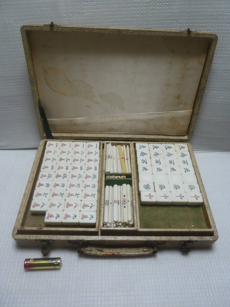 マージャン牌、点棒ともに全て不揃いです。 ジャンク品です。 サイズ(約):横幅 29.8cm×奥行 19.5cm×高さ 4.5cm 付属品 ・画像1枚目に写っている物が全てです。 その他の付属品はありません。 状態 ・全体にキズ、汚れ、変色などダメージ目立ちます。 ・点棒は違うマージャン牌の点棒も混ざっています。 ・ケースはキズ、汚れなどダメージ目立ちます。 | ||||