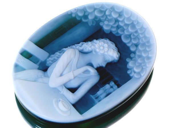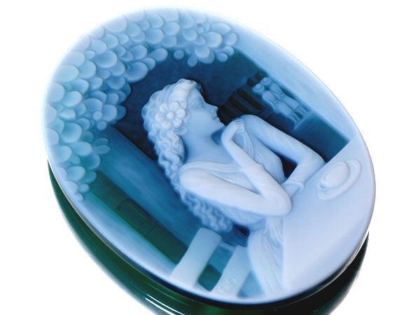 綺麗な貴婦人を繊細に彫刻された、魅力的な高級グリーンストーンカメオルースです!